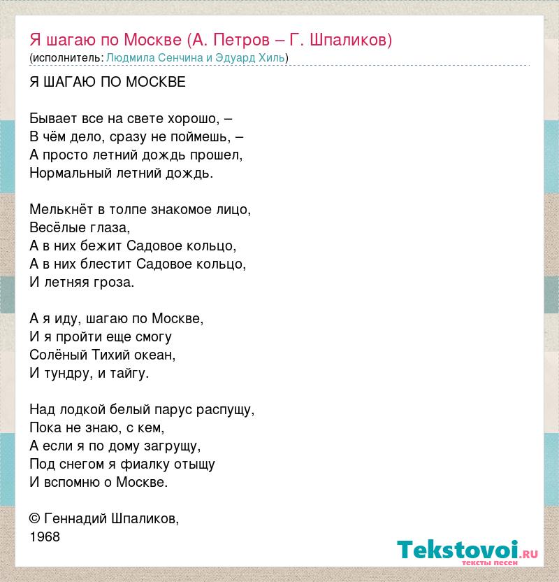 Я ШАГАЮ ПО МОСКВЕ Бывает все на свете хорошо, – В чём дело, сразу не поймешь, – А просто летний дождь прошел, Нормальный летний дождь. Мелькнёт в толпе знакомое лицо, Весёлые глаза, А в них бежит Садовое кольцо, А в них блестит Садовое кольцо, И летняя гроза. А я иду, шагаю по Москве, И я пройти еще смогу Солёный Тихий океан, И тундру, и тайгу. Над лодкой белый парус распущу, Пока не знаю, с кем, А если я по дому загрущу, Под снегом я фиалку отыщу И вспомню о Москве. © Геннадий Шпаликов, 1968