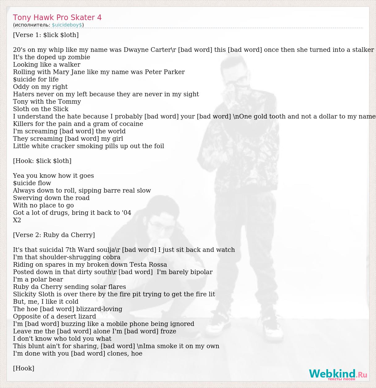 [Verse 1: $lick $loth] 20's on my whip like my name was Dwayne Carter\r [bad word] this [bad word] once then she turned into a stalker It's the doped up zombie Looking like a walker Rolling with Mary Jane like my name was Peter Parker $uicide for life Oddy on my right Haters never on my left because they are never in my sight Tony with the Tommy Sloth on the Slick I understand the hate because I probably [bad word] your [bad word] \nOne gold tooth and not a dollar to my name Killers for the pain and a gram of cocaine I'm screaming [bad word] the world They screaming [bad word] my girl Little white cracker smoking pills up out the foil [Hook: $lick $loth] Yea you know how it goes $uicide flow Always down to roll, sipping barre real slow Swerving down the road With no place to go Got a lot of drugs, bring it back to '04 X2 [Verse 2: Ruby da Cherry] It's that suicidal 7th Ward soulja\r [bad word] I just sit back and watch I'm that shoulder-shrugging cobra Riding on spares in my broken down Testa Rossa Posted down in that dirty south\r [bad word] I'm barely bipolar I'm a polar bear Ruby da Cherry sending solar flares Slickity Sloth is over there by the fire pit trying to get the fire lit But, me, I like it cold The hoe [bad word] blizzard-loving Opposite of a desert lizard I'm [bad word] buzzing like a mobile phone being ignored Leave me the [bad word] alone I'm [bad word] froze I don't know who told you what This blunt ain't for sharing, [bad word] \nIma smoke it on my own I'm done with you [bad word] clones, hoe [Hook]