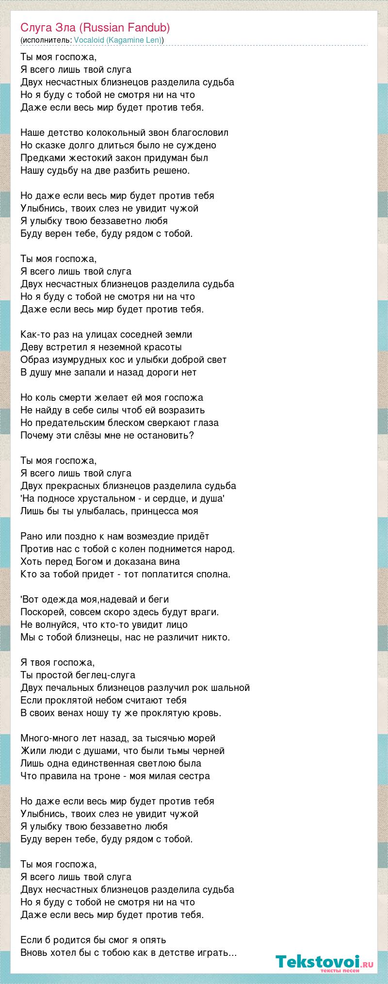 Ты моя госпожа, Я всего лишь твой слуга Двух несчастных близнецов разделила судьба Но я буду с тобой не смотря ни на что Даже если весь мир будет против тебя. Наше детство колокольный звон благословил Но сказке долго длиться было не суждено Предками жестокий закон придуман был Нашу судьбу на две разбить решено. Но даже если весь мир будет против тебя Улыбнись, твоих слез не увидит чужой Я улыбку твою беззаветно любя Буду верен тебе, буду рядом с тобой. Ты моя госпожа, Я всего лишь твой слуга Двух несчастных близнецов разделила судьба Но я буду с тобой не смотря ни на что Даже если весь мир будет против тебя. Как-то раз на улицах соседней земли Деву встретил я неземной красоты Образ изумрудных кос и улыбки доброй свет В душу мне запали и назад дороги нет Но коль смерти желает ей моя госпожа Не найду в себе силы чтоб ей возразить Но предательским блеском сверкают глаза Почему эти слёзы мне не остановить? Ты моя госпожа, Я всего лишь твой слуга Двух прекрасных близнецов разделила судьба 'На подносе хрустальном - и сердце, и душа' Лишь бы ты улыбалась, принцесса моя Рано или поздно к нам возмездие придёт Против нас с тобой с колен поднимется народ. Хоть перед Богом и доказана вина Кто за тобой придет - тот поплатится сполна. 'Вот одежда моя,надевай и беги Поскорей, совсем скоро здесь будут враги. Не волнуйся, что кто-то увидит лицо Мы с тобой близнецы, нас не различит никто. Я твоя госпожа, Ты простой беглец-слуга Двух печальных близнецов разлучил рок шальной Если проклятой небом считают тебя В своих венах ношу ту же проклятую кровь. Много-много лет назад, за тысячью морей Жили люди с душами, что были тьмы черней Лишь одна единственная светлою была Что правила на троне - моя милая сестра Но даже если весь мир будет против тебя Улыбнись, твоих слез не увидит чужой Я улыбку твою беззаветно любя Буду верен тебе, буду рядом с тобой. Ты моя госпожа, Я всего лишь твой слуга Двух несчастных близнецов разделила судьба Но я буду с тобой не смотря ни на что Даже если весь мир будет против тебя. Если б родится бы смог я опять Вновь хотел бы с тобою как в детстве играть...