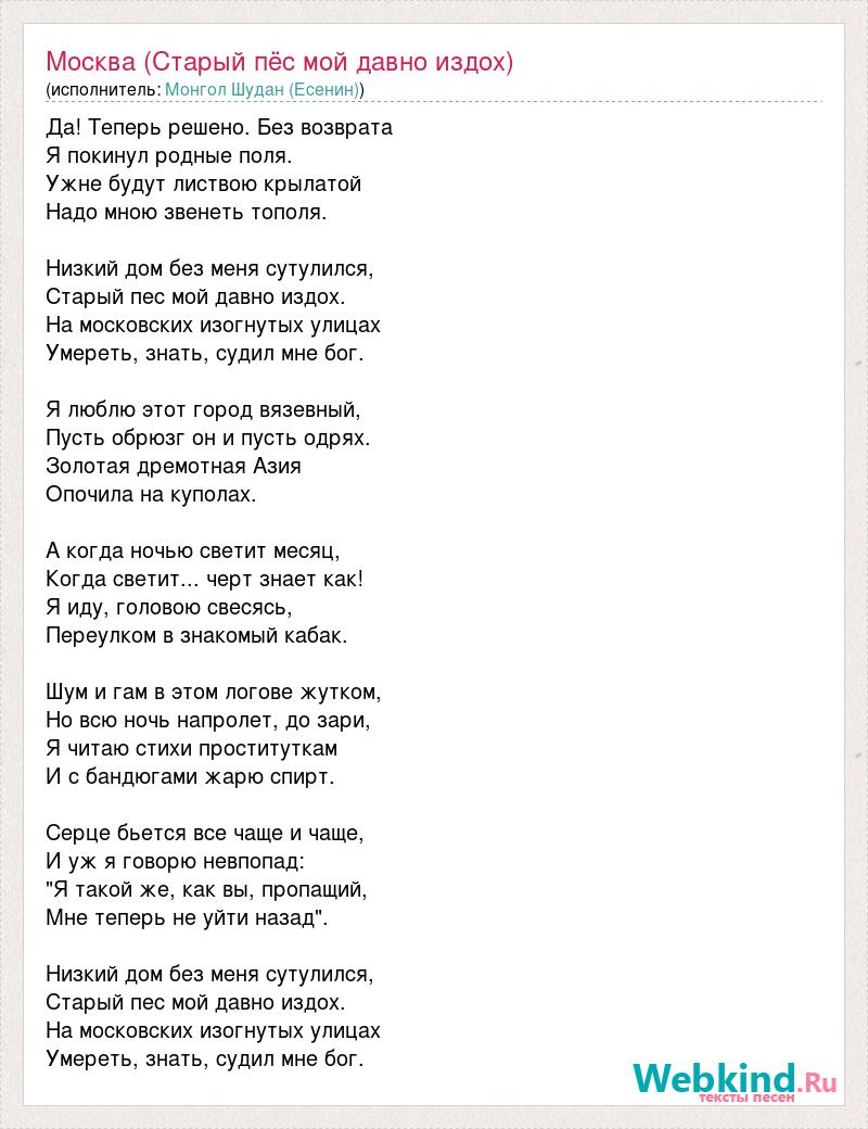 Да! Теперь решено. Без возврата Я покинул родные поля. Ужне будут листвою крылатой Надо мною звенеть тополя. Низкий дом без меня сутулился, Старый пес мой давно издох. На московских изогнутых улицах Умереть, знать, судил мне бог. Я люблю этот город вязевный, Пусть обрюзг он и пусть одрях. Золотая дремотная Азия Опочила на куполах. А когда ночью светит месяц, Когда светит... черт знает как! Я иду, головою свесясь, Переулком в знакомый кабак. Шум и гам в этом логове жутком, Но всю ночь напролет, до зари, Я читаю стихи проституткам И с бандюгами жарю спирт. Серце бьется все чаще и чаще, И уж я говорю невпопад: "Я такой же, как вы, пропащий, Мне теперь не уйти назад". Низкий дом без меня сутулился, Старый пес мой давно издох. На московских изогнутых улицах Умереть, знать, судил мне бог.