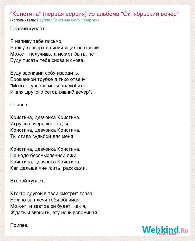 Первый куплет: Я напишу тебе письмо, Брошу конверт в синий ящик почтовый. Может, получишь, а может быть, нет. Буду писать тебе снова и снова. Буду звонками себя изводить, Брошенной трубке я тихо отвечу: "Может, успела меня разлюбить, И для другого сегодняшний вечер". Припев: Кристина, девчонка Кристина. Игрушка вчерашнего дня. Кристина, девчонка Кристина. Ты стала судьбой для меня. Кристина, девчонка Кристина. Не надо бессмысленной лжи. Кристина, девчонка Кристина. Как дальше мне жить, расскажи. Второй куплет: Кто-то другой в твои смотрит глаза, Нежно за плечи тебя обнимая. Может, и завтра он будет, как я, Ждать и звонить, эту ночь вспоминая. Припев.