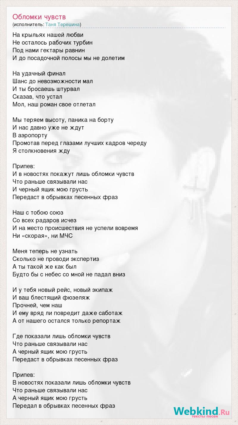 На крыльях нашей любви Не осталось рабочих турбин Под нами гектары равнин И до посадочной полосы мы не долетим На удачный финал Шанс до невозможности мал И ты бросаешь штурвал Сказав, что устал Мол, наш роман свое отлетал Мы теряем высоту, паника на борту И нас давно уже не ждут В аэропорту Промотав перед глазами лучших кадров череду Я столкновения жду Припев: И в новостях покажут лишь обломки чувств Что раньше связывали нас И черный ящик мою грусть Передаст в обрывках песенных фраз Наш с тобою союз Со всех радаров исчез И на место происшествия не успели вовремя Ни «скорая», ни МЧС Меня теперь не узнать Сколько не проводи экспертиз А ты такой же как был Будто бы с небес со мной не падал вниз И у тебя новый рейс, новый экипаж И ваш блестящий фюзеляж Прочней, чем наш И ему вряд ли повредит даже саботаж А от нашего остался только репортаж Где показали лишь обломки чувств Что раньше связывали нас А черный ящик мою грусть Передаст в обрывках песенных фраз Припев: В новостях показали лишь обломки чувств Что раньше связывали нас А черный ящик мою грусть Передал в обрывках песенных фраз