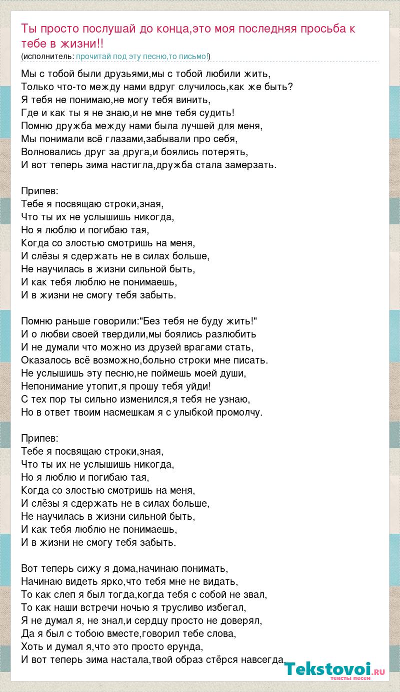Мы с тобой были друзьями,мы с тобой любили жить, Только что-то между нами вдруг случилось,как же быть? Я тебя не понимаю,не могу тебя винить, Где и как ты я не знаю,и не мне тебя судить! Помню дружба между нами была лучшей для меня, Мы понимали всё глазами,забывали про себя, Волновались друг за друга,и боялись потерять, И вот теперь зима настигла,дружба стала замерзать. Припев: Тебе я посвящаю строки,зная, Что ты их не услышишь никогда, Но я люблю и погибаю тая, Когда со злостью смотришь на меня, И слёзы я сдержать не в силах больше, Не научилась в жизни сильной быть, И как тебя люблю не понимаешь, И в жизни не смогу тебя забыть. Помню раньше говорили:"Без тебя не буду жить!" И о любви своей твердили,мы боялись разлюбить И не думали что можно из друзей врагами стать, Оказалось всё возможно,больно строки мне писать. Не услышишь эту песню,не поймешь моей души, Непонимание утопит,я прошу тебя уйди! С тех пор ты сильно изменился,я тебя не узнаю, Но в ответ твоим насмешкам я с улыбкой промолчу. Припев: Тебе я посвящаю строки,зная, Что ты их не услышишь никогда, Но я люблю и погибаю тая, Когда со злостью смотришь на меня, И слёзы я сдержать не в силах больше, Не научилась в жизни сильной быть, И как тебя люблю не понимаешь, И в жизни не смогу тебя забыть. Вот теперь сижу я дома,начинаю понимать, Начинаю видеть ярко,что тебя мне не видать, То как слеп я был тогда,когда тебя с собой не звал, То как наши встречи ночью я трусливо избегал, Я не думал я, не знал,и сердцу просто не доверял, Да я был с тобою вместе,говорил тебе слова, Хоть и думал я,что это просто ерунда, И вот теперь зима настала,твой образ стёрся навсегда.