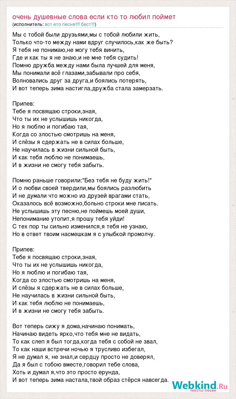 Мы с тобой были друзьями,мы с тобой любили жить, Только что-то между нами вдруг случилось,как же быть? Я тебя не понимаю,не могу тебя винить, Где и как ты я не знаю,и не мне тебя судить! Помню дружба между нами была лучшей для меня, Мы понимали всё глазами,забывали про себя, Волновались друг за друга,и боялись потерять, И вот теперь зима настигла,дружба стала замерзать. Припев: Тебе я посвящаю строки,зная, Что ты их не услышишь никогда, Но я люблю и погибаю тая, Когда со злостью смотришь на меня, И слёзы я сдержать не в силах больше, Не научилась в жизни сильной быть, И как тебя люблю не понимаешь, И в жизни не смогу тебя забыть. Помню раньше говорили:"Без тебя не буду жить!" И о любви своей твердили,мы боялись разлюбить И не думали что можно из друзей врагами стать, Оказалось всё возможно,больно строки мне писать. Не услышишь эту песню,не поймешь моей души, Непонимание утопит,я прошу тебя уйди! С тех пор ты сильно изменился,я тебя не узнаю, Но в ответ твоим насмешкам я с улыбкой промолчу. Припев: Тебе я посвящаю строки,зная, Что ты их не услышишь никогда, Но я люблю и погибаю тая, Когда со злостью смотришь на меня, И слёзы я сдержать не в силах больше, Не научилась в жизни сильной быть, И как тебя люблю не понимаешь, И в жизни не смогу тебя забыть. Вот теперь сижу я дома,начинаю понимать, Начинаю видеть ярко,что тебя мне не видать, То как слеп я был тогда,когда тебя с собой не звал, То как наши встречи ночью я трусливо избегал, Я не думал я, не знал,и сердцу просто не доверял, Да я был с тобою вместе,говорил тебе слова, Хоть и думал я,что это просто ерунда, И вот теперь зима настала,твой образ стёрся навсегда.