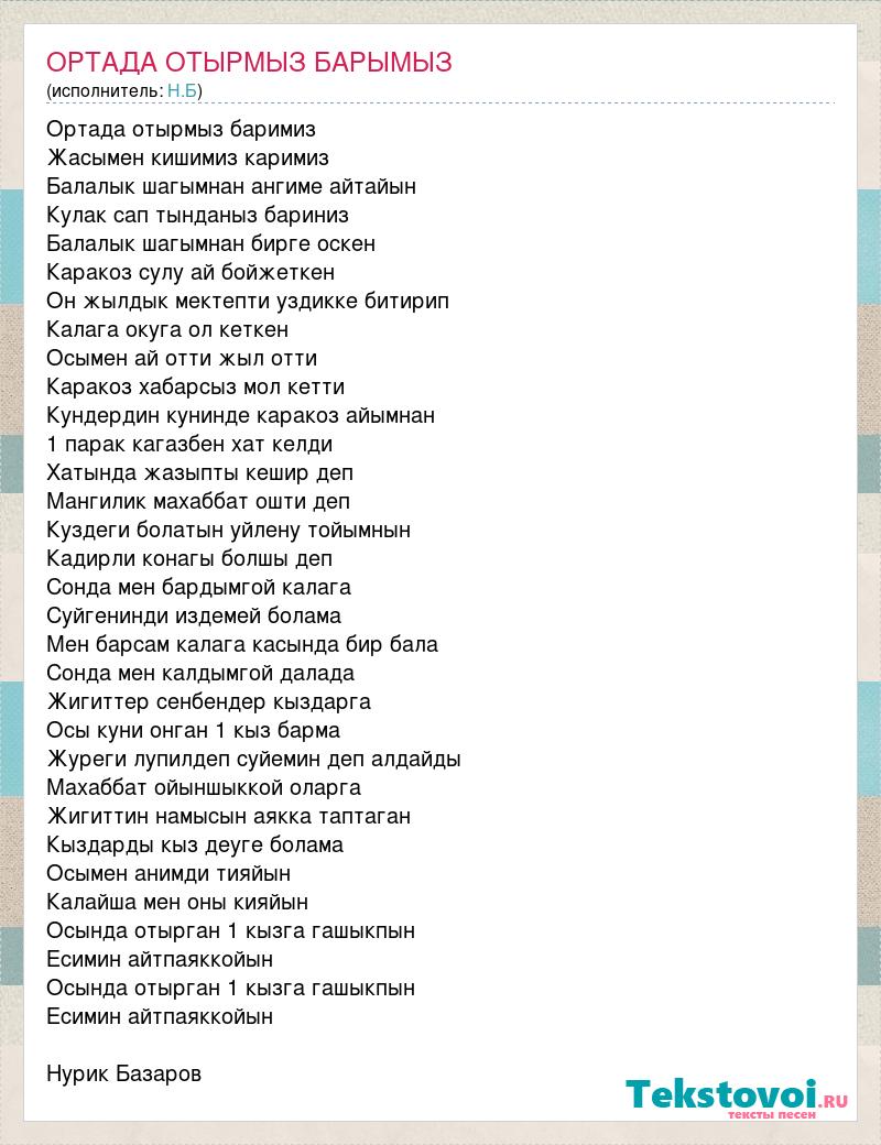 Ортада отырмыз баримиз Жасымен кишимиз каримиз Балалык шагымнан ангиме айтайын Кулак сап тынданыз бариниз Балалык шагымнан бирге оскен Каракоз сулу ай бойжеткен Он жылдык мектепти уздикке битирип Калага окуга ол кеткен Осымен ай отти жыл отти Каракоз хабарсыз мол кетти Кундердин кунинде каракоз айымнан 1 парак кагазбен хат келди Хатында жазыпты кешир деп Мангилик махаббат ошти деп Куздеги болатын уйлену тойымнын Кадирли конагы болшы деп Сонда мен бардымгой калага Суйгенинди издемей болама Мен барсам калага касында бир бала Сонда мен калдымгой далада Жигиттер сенбендер кыздарга Осы куни онган 1 кыз барма Журеги лупилдеп суйемин деп алдайды Махаббат ойыншыккой оларга Жигиттин намысын аякка таптаган Кыздарды кыз деуге болама Осымен анимди тияйын Калайша мен оны кияйын Осында отырган 1 кызга гашыкпын Есимин айтпаяккойын Осында отырган 1 кызга гашыкпын Есимин айтпаяккойын Нурик Базаров