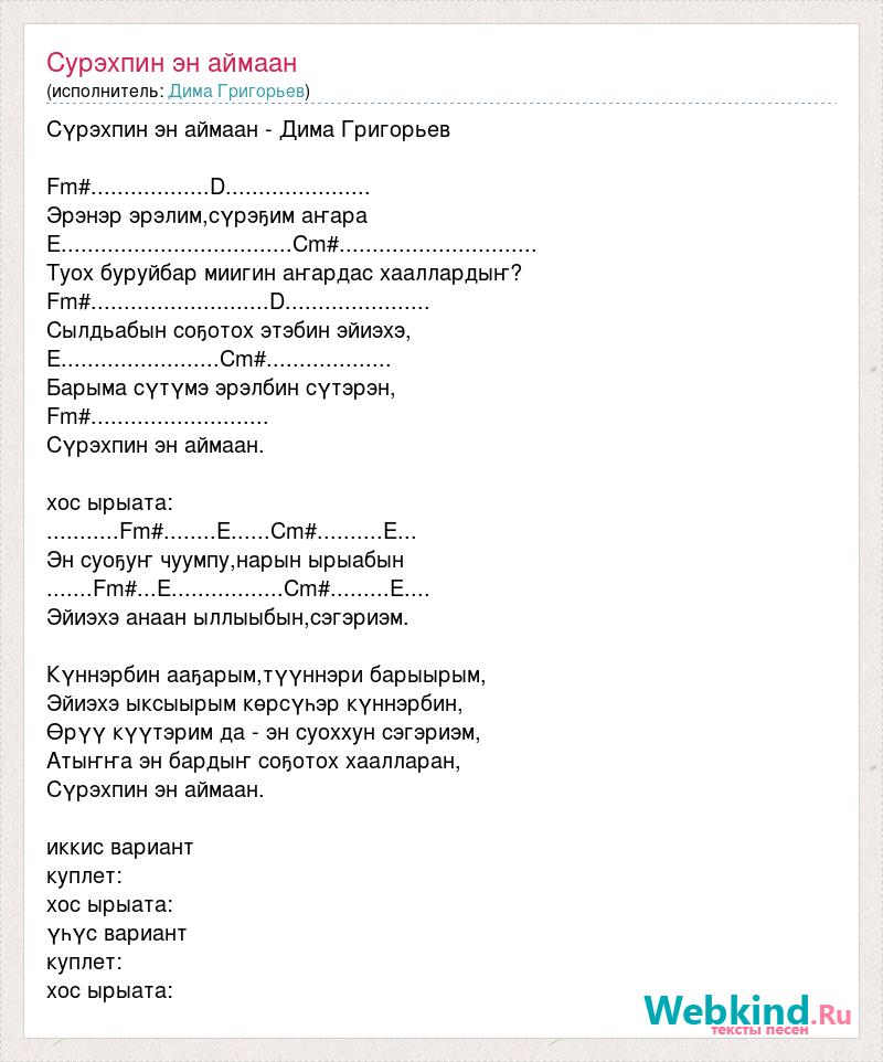 Сүрэхпин эн аймаан - Дима Григорьев Fm#..................D...................... Эрэнэр эрэлим,сүрэҕим аҥара E...................................Cm#.............................. Туох буруйбар миигин аҥардас хааллардыҥ? Fm#...........................D...................... Сылдьабын соҕотох этэбин эйиэхэ, E........................Cm#................... Барыма сүтүмэ эрэлбин сүтэрэн, Fm#........................... Сүрэхпин эн аймаан. хос ырыата: ...........Fm#........E......Cm#..........E... Эн суоҕуҥ чуумпу,нарын ырыабын .......Fm#...E.................Cm#.........E.... Эйиэхэ анаан ыллыыбын,сэгэриэм. Күннэрбин ааҕарым,түүннэри барыырым, Эйиэхэ ыксыырым көрсүһэр күннэрбин, Өрүү күүтэрим да - эн суоххун сэгэриэм, Атыҥҥа эн бардыҥ соҕотох хаалларан, Сүрэхпин эн аймаан. иккис вариант куплет: хос ырыата: үһүс вариант куплет: хос ырыата: