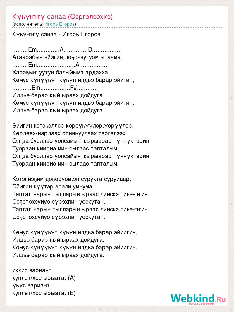 Күһүҥҥү санаа - Игорь Егоров .........Em.............A..............D................. Атаарабын эйигин,доҕоччугуом ытаама .........Em......................A................ Хараҕыҥ уутун балыйыма ардахха, Көмус күнүүһүт күһүн илдьэ барар эйигин, ...........Em.................F#............ Илдьэ барар кый ыраах дойдуга. Көмус күнүүһүт күһүн илдьэ барар эйигин, Илдьэ барар кый ыраах дойдуга. Эйигин кэтэһэллэр көрсүһүүлэр,үөрүүлэр, Көрдөөх-нардаах оонньуулаах сэргэлээх. Ол да буоллар уопсайыҥ кырыарар түннүктэрин Туораан киириэ мин сылаас тапталым. Ол да буоллар уопсайыҥ кырыарар түннүктэрин Туораан киириэ мин сылаас тапталым. Кэтэһиэҕим доҕоруом,эн сурукта суруйаар, Эйигин күүтэр эрэли умнума, Таптал нарын тылларын ыраас лиискэ тиһэҥҥин Соҕотохсуйуо сүрэхпин уоскутан. Таптал нарын тылларын ыраас лиискэ тиһэҥҥин Соҕотохсуйуо сүрэхпин уоскутан. Көмус күнүүһүт күһүн илдьэ барар эйиигин, Илдьэ барар кый ыраах дойдуга. Көмус күнүүһүт күһүн илдьэ барар эйиигин, Илдьэ барар кый ыраах дойдуга. иккис вариант куплет/хос ырыата: (A) үһүс вариант куплет/хос ырыата: (E)