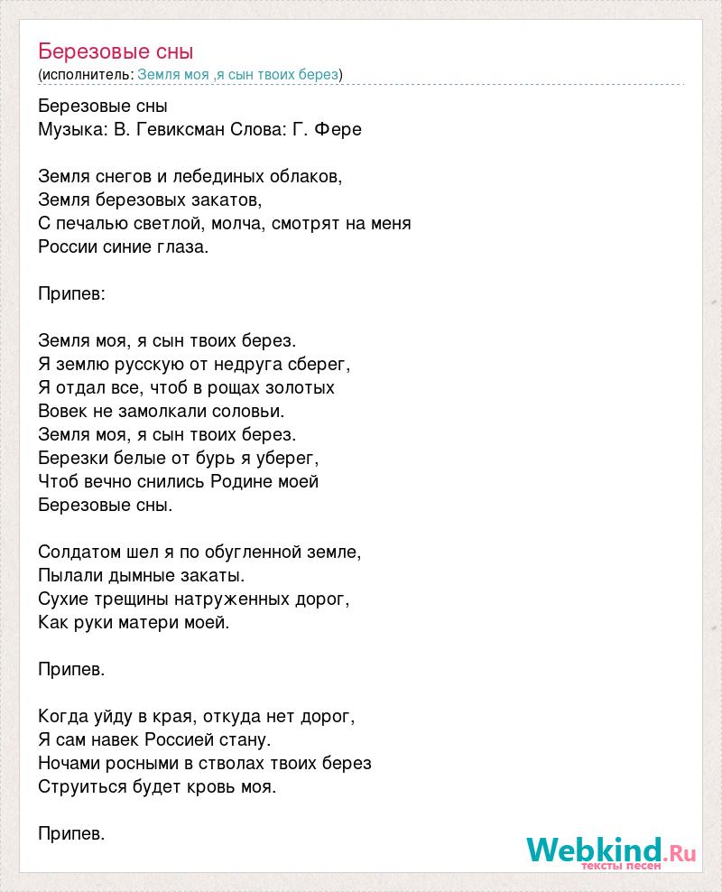 Березовые сны Музыка: В. Гевиксман Слова: Г. Фере Земля снегов и лебединых облаков, Земля березовых закатов, С печалью светлой, молча, смотрят на меня России синие глаза. Припев: Земля моя, я сын твоих берез. Я землю русскую от недруга сберег, Я отдал все, чтоб в рощах золотых Вовек не замолкали соловьи. Земля моя, я сын твоих берез. Березки белые от бурь я уберег, Чтоб вечно снились Родине моей Березовые сны. Солдатом шел я по обугленной земле, Пылали дымные закаты. Сухие трещины натруженных дорог, Как руки матери моей. Припев. Когда уйду в края, откуда нет дорог, Я сам навек Россией стану. Ночами росными в стволах твоих берез Струиться будет кровь моя. Припев.