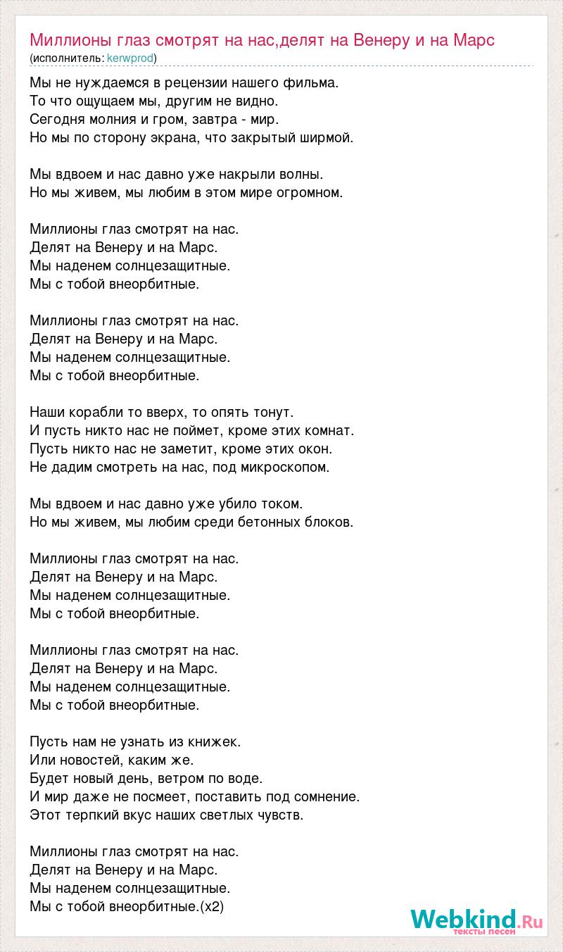 Мы не нуждаемся в рецензии нашего фильма. То что ощущаем мы, другим не видно. Сегодня молния и гром, завтра - мир. Но мы по сторону экрана, что закрытый ширмой. Мы вдвоем и нас давно уже накрыли волны. Но мы живем, мы любим в этом мире огромном. Миллионы глаз смотрят на нас. Делят на Венеру и на Марс. Мы наденем солнцезащитные. Мы с тобой внеорбитные. Миллионы глаз смотрят на нас. Делят на Венеру и на Марс. Мы наденем солнцезащитные. Мы с тобой внеорбитные. Наши корабли то вверх, то опять тонут. И пусть никто нас не поймет, кроме этих комнат. Пусть никто нас не заметит, кроме этих окон. Не дадим смотреть на нас, под микроскопом. Мы вдвоем и нас давно уже убило током. Но мы живем, мы любим среди бетонных блоков. Миллионы глаз смотрят на нас. Делят на Венеру и на Марс. Мы наденем солнцезащитные. Мы с тобой внеорбитные. Миллионы глаз смотрят на нас. Делят на Венеру и на Марс. Мы наденем солнцезащитные. Мы с тобой внеорбитные. Пусть нам не узнать из книжек. Или новостей, каким же. Будет новый день, ветром по воде. И мир даже не посмеет, поставить под сомнение. Этот терпкий вкус наших светлых чувств. Миллионы глаз смотрят на нас. Делят на Венеру и на Марс. Мы наденем солнцезащитные. Мы с тобой внеорбитные.(х2)