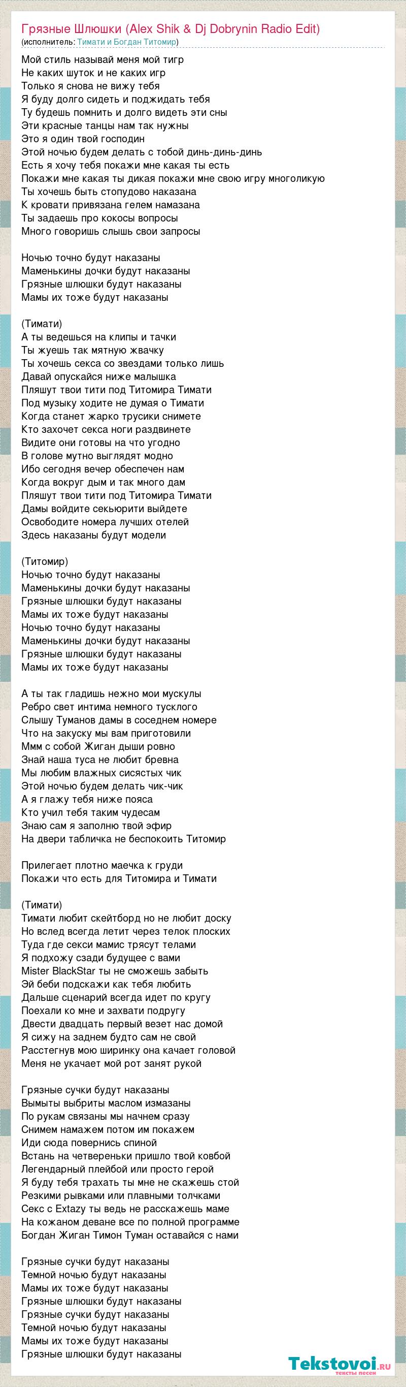 Мой стиль называй меня мой тигр Не каких шуток и не каких игр Только я снова не вижу тебя Я буду долго сидеть и поджидать тебя Ту будешь помнить и долго видеть эти сны Эти красные танцы нам так нужны Это я один твой господин Этой ночью будем делать с тобой динь-динь-динь Есть я хочу тебя покажи мне какая ты есть Покажи мне какая ты дикая покажи мне свою игру многоликую Ты хочешь быть стопудово наказана К кровати привязана гелем намазана Ты задаешь про кокосы вопросы Много говоришь слышь свои запросы Ночью точно будут наказаны Маменькины дочки будут наказаны Грязные шлюшки будут наказаны Мамы их тоже будут наказаны (Тимати) А ты ведешься на клипы и тачки Ты жуешь так мятную жвачку Ты хочешь секса со звездами только лишь Давай опускайся ниже малышка Пляшут твои тити под Титомира Тимати Под музыку ходите не думая о Тимати Когда станет жарко трусики снимете Кто захочет секса ноги раздвинете Видите они готовы на что угодно В голове мутно выглядят модно Ибо сегодня вечер обеспечен нам Когда вокруг дым и так много дам Пляшут твои тити под Титомира Тимати Дамы войдите секьюрити выйдете Освободите номера лучших отелей Здесь наказаны будут модели (Титомир) Ночью точно будут наказаны Маменькины дочки будут наказаны Грязные шлюшки будут наказаны Мамы их тоже будут наказаны Ночью точно будут наказаны Маменькины дочки будут наказаны Грязные шлюшки будут наказаны Мамы их тоже будут наказаны А ты так гладишь нежно мои мускулы Ребро свет интима немного тусклого Слышу Туманов дамы в соседнем номере Что на закуску мы вам приготовили Ммм с собой Жиган дыши ровно Знай наша туса не любит бревна Мы любим влажных сисястых чик Этой ночью будем делать чик-чик А я глажу тебя ниже пояса Кто учил тебя таким чудесам Знаю сам я заполню твой эфир На двери табличка не беспокоить Титомир Прилегает плотно маечка к груди Покажи что есть для Титомира и Тимати (Тимати) Тимати любит скейтборд но не любит доску Но вслед всегда летит через телок плоских Туда где секси мамис трясут телами Я подхожу сзади будущее с вами Mister BlackStar ты не сможешь забыть Эй беби подскажи как тебя любить Дальше сценарий всегда идет по кругу Поехали ко мне и захвати подругу Двести двадцать первый везет нас домой Я сижу на заднем будто сам не свой Расстегнув мою ширинку она качает головой Меня не укачает мой рот занят рукой Грязные сучки будут наказаны Вымыты выбриты маслом измазаны По рукам связаны мы начнем сразу Снимем намажем потом им покажем Иди сюда повернись спиной Встань на четвереньки пришло твой ковбой Легендарный плейбой или просто герой Я буду тебя трахать ты мне не скажешь стой Резкими рывками или плавными толчками Секс с Extazy ты ведь не расскажешь маме На кожаном деване все по полной программе Богдан Жиган Тимон Туман оставайся с нами Грязные сучки будут наказаны Темной ночью будут наказаны Мамы их тоже будут наказаны Грязные шлюшки будут наказаны Грязные сучки будут наказаны Темной ночью будут наказаны Мамы их тоже будут наказаны Грязные шлюшки будут наказаны