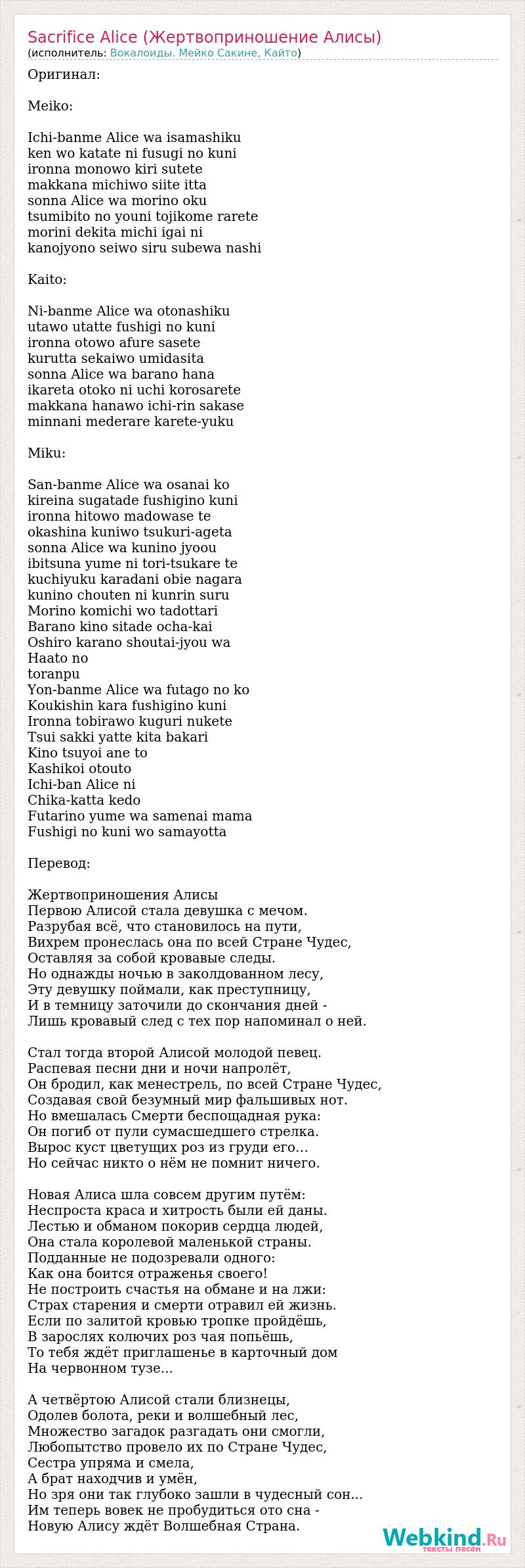 Оригинал: Meiko: Ichi-banme Alice wa isamashiku ken wo katate ni fusugi no kuni ironna monowo kiri sutete makkana michiwo siite itta sonna Alice wa morino oku tsumibito no youni tojikome rarete morini dekita michi igai ni kanojyono seiwo siru subewa nashi Kaito: Ni-banme Alice wa otonashiku utawo utatte fushigi no kuni ironna otowo afure sasete kurutta sekaiwo umidasita sonna Alice wa barano hana ikareta otoko ni uchi korosarete makkana hanawo ichi-rin sakase minnani mederare karete-yuku Miku: San-banme Alice wa osanai ko kireina sugatade fushigino kuni ironna hitowo madowase te okashina kuniwo tsukuri-ageta sonna Alice wa kunino jyoou ibitsuna yume ni tori-tsukare te kuchiyuku karadani obie nagara kunino chouten ni kunrin suru Morino komichi wo tadottari Barano kino sitade ocha-kai Oshiro karano shoutai-jyou wa Haato no toranpu Yon-banme Alice wa futago no ko Koukishin kara fushigino kuni Ironna tobirawo kuguri nukete Tsui sakki yatte kita bakari Kino tsuyoi ane to Kashikoi otouto Ichi-ban Alice ni Chika-katta kedo Futarino yume wa samenai mama Fushigi no kuni wo samayotta Перевод: Жертвоприношения Алисы Первою Алисой стала девушка с мечом. Разрубая всё, что становилось на пути, Вихрем пронеслась она по всей Стране Чудес, Оставляя за собой кровавые следы. Но однажды ночью в заколдованном лесу, Эту девушку поймали, как преступницу, И в темницу заточили до скончания дней - Лишь кровавый след с тех пор напоминал о ней. Стал тогда второй Алисой молодой певец. Распевая песни дни и ночи напролёт, Он бродил, как менестрель, по всей Стране Чудес, Создавая свой безумный мир фальшивых нот. Но вмешалась Смерти беспощадная рука: Он погиб от пули сумасшедшего стрелка. Вырос куст цветущих роз из груди его… Но сейчас никто о нём не помнит ничего. Новая Алиса шла совсем другим путём: Неспроста краса и хитрость были ей даны. Лестью и обманом покорив сердца людей, Она стала королевой маленькой страны. Подданные не подозревали одного: Как она боится отраженья своего! Не построить счастья на обмане и на лжи: Страх старения и смерти отравил ей жизнь. Если по залитой кровью тропке пройдёшь, В зарослях колючих роз чая попьёшь, То тебя ждёт приглашенье в карточный дом На червонном тузе... А четвёртою Алисой стали близнецы, Одолев болота, реки и волшебный лес, Множество загадок разгадать они смогли, Любопытство провело их по Стране Чудес, Сестра упряма и смела, А брат находчив и умён, Но зря они так глубоко зашли в чудесный сон... Им теперь вовек не пробудиться ото сна - Новую Алису ждёт Волшебная Страна.