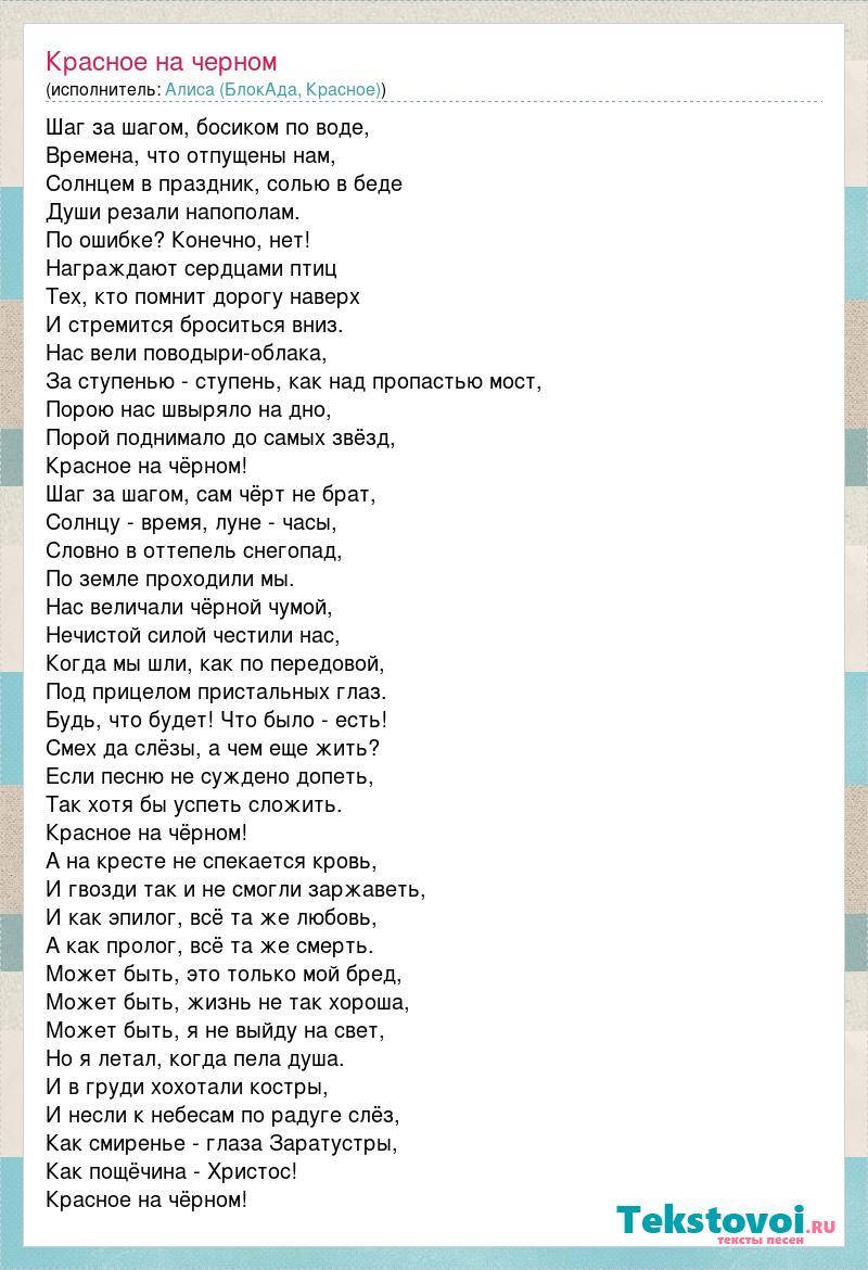 Шаг за шагом, босиком по воде, Времена, что отпущены нам, Солнцем в праздник, солью в беде Души резали напополам. По ошибке? Конечно, нет! Награждают сердцами птиц Тех, кто помнит дорогу наверх И стремится броситься вниз. Нас вели поводыри-облака, За ступенью - ступень, как над пропастью мост, Порою нас швыряло на дно, Порой поднимало до самых звёзд, Красное на чёрном! Шаг за шагом, сам чёрт не брат, Солнцу - время, луне - часы, Словно в оттепель снегопад, По земле проходили мы. Нас величали чёрной чумой, Нечистой силой честили нас, Когда мы шли, как по передовой, Под прицелом пристальных глаз. Будь, что будет! Что было - есть! Смех да слёзы, а чем еще жить? Если песню не суждено допеть, Так хотя бы успеть сложить. Красное на чёрном! А на кресте не спекается кровь, И гвозди так и не смогли заржаветь, И как эпилог, всё та же любовь, А как пролог, всё та же смерть. Может быть, это только мой бред, Может быть, жизнь не так хороша, Может быть, я не выйду на свет, Но я летал, когда пела душа. И в груди хохотали костры, И несли к небесам по радуге слёз, Как смиренье - глаза Заратустры, Как пощёчина - Христос! Красное на чёрном!