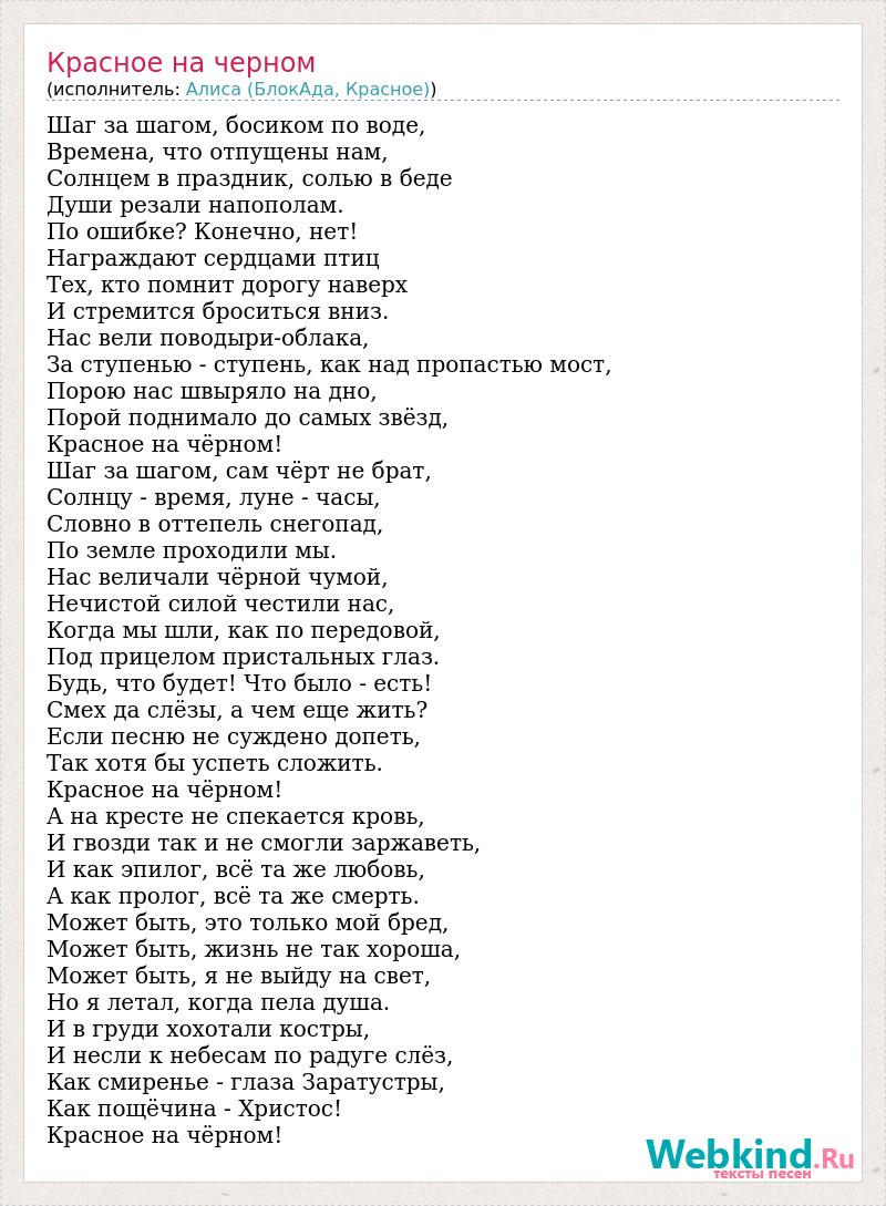 Шаг за шагом, босиком по воде, Времена, что отпущены нам, Солнцем в праздник, солью в беде Души резали напополам. По ошибке? Конечно, нет! Награждают сердцами птиц Тех, кто помнит дорогу наверх И стремится броситься вниз. Нас вели поводыри-облака, За ступенью - ступень, как над пропастью мост, Порою нас швыряло на дно, Порой поднимало до самых звёзд, Красное на чёрном! Шаг за шагом, сам чёрт не брат, Солнцу - время, луне - часы, Словно в оттепель снегопад, По земле проходили мы. Нас величали чёрной чумой, Нечистой силой честили нас, Когда мы шли, как по передовой, Под прицелом пристальных глаз. Будь, что будет! Что было - есть! Смех да слёзы, а чем еще жить? Если песню не суждено допеть, Так хотя бы успеть сложить. Красное на чёрном! А на кресте не спекается кровь, И гвозди так и не смогли заржаветь, И как эпилог, всё та же любовь, А как пролог, всё та же смерть. Может быть, это только мой бред, Может быть, жизнь не так хороша, Может быть, я не выйду на свет, Но я летал, когда пела душа. И в груди хохотали костры, И несли к небесам по радуге слёз, Как смиренье - глаза Заратустры, Как пощёчина - Христос! Красное на чёрном!