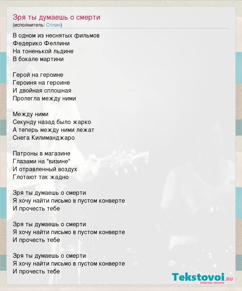 В одном из неснятых фильмов Федерико Феллини На тоненькой льдине В бокале мартини Герой на героине Героиня на героине И двойная сплошная Пролегла между ними Между ними Секунду назад было жарко А теперь между ними лежат Снега Килиманджаро Патроны в магазине Глазами на "визине" И отравленный воздух Глотают так жадно Зря ты думаешь о смерти Я хочу найти письмо в пустом конверте И прочесть тебе Зря ты думаешь о смерти Я хочу найти письмо в пустом конверте И прочесть тебе Зря ты думаешь о смерти Я хочу найти письмо в пустом конверте И прочесть тебе