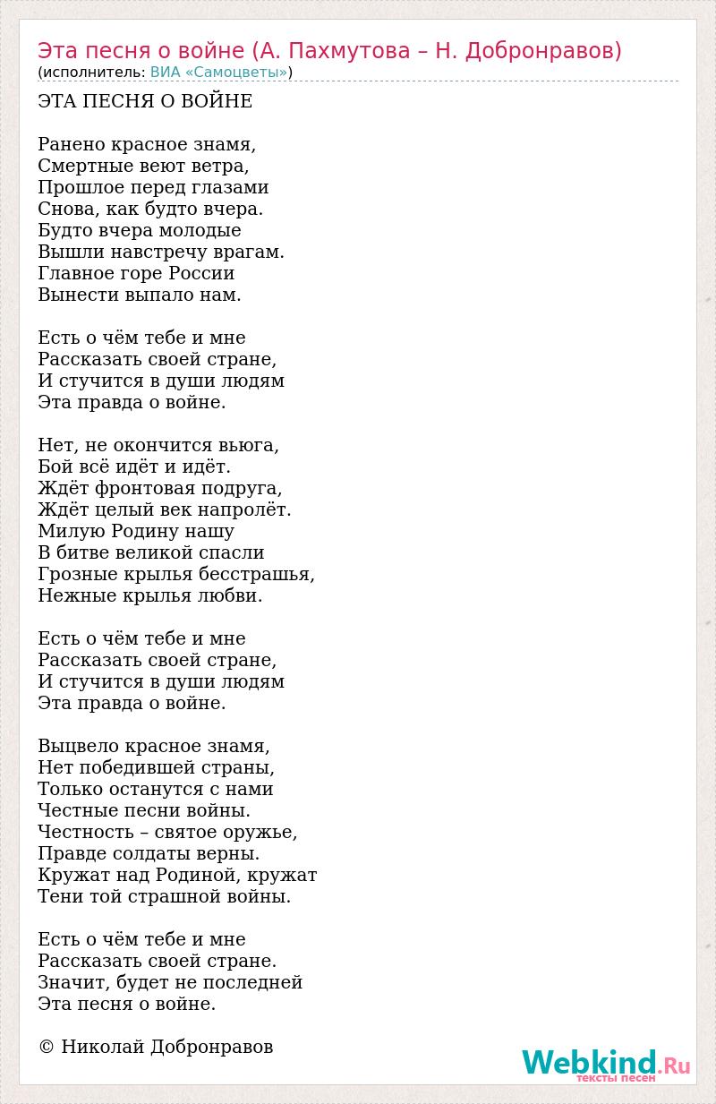 ЭТА ПЕСНЯ О ВОЙНЕ Ранено красное знамя, Смертные веют ветра, Прошлое перед глазами Снова, как будто вчера. Будто вчера молодые Вышли навстречу врагам. Главное горе России Вынести выпало нам. Есть о чём тебе и мне Рассказать своей стране, И стучится в души людям Эта правда о войне. Нет, не окончится вьюга, Бой всё идёт и идёт. Ждёт фронтовая подруга, Ждёт целый век напролёт. Милую Родину нашу В битве великой спасли Грозные крылья бесстрашья, Нежные крылья любви. Есть о чём тебе и мне Рассказать своей стране, И стучится в души людям Эта правда о войне. Выцвело красное знамя, Нет победившей страны, Только останутся с нами Честные песни войны. Честность – святое оружье, Правде солдаты верны. Кружат над Родиной, кружат Тени той страшной войны. Есть о чём тебе и мне Рассказать своей стране. Значит, будет не последней Эта песня о войне. © Николай Добронравов