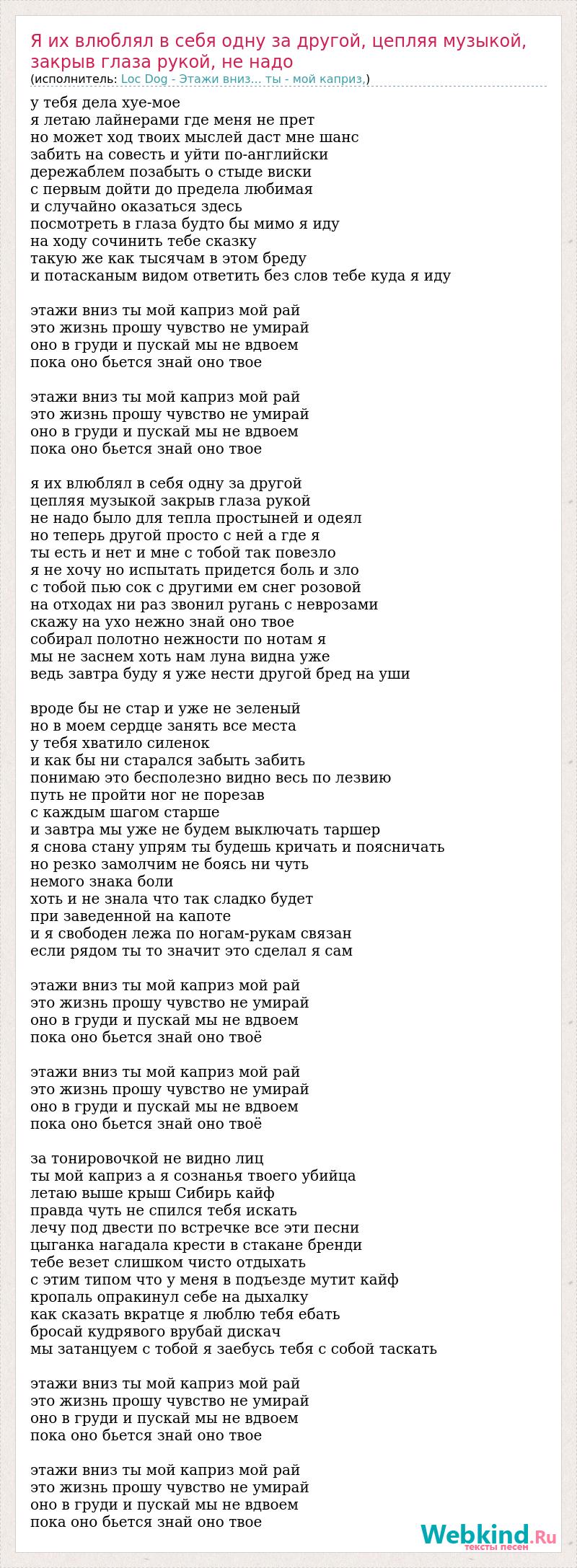 у тебя дела хуе-мое я летаю лайнерами где меня не прет но может ход твоих мыслей даст мне шанс забить на совесть и уйти по-английски дережаблем позабыть о стыде виски с первым дойти до предела любимая и случайно оказаться здесь посмотреть в глаза будто бы мимо я иду на ходу сочинить тебе сказку такую же как тысячам в этом бреду и потасканым видом ответить без слов тебе куда я иду этажи вниз ты мой каприз мой рай это жизнь прошу чувство не умирай оно в груди и пускай мы не вдвоем пока оно бьется знай оно твое этажи вниз ты мой каприз мой рай это жизнь прошу чувство не умирай оно в груди и пускай мы не вдвоем пока оно бьется знай оно твое я их влюблял в себя одну за другой цепляя музыкой закрыв глаза рукой не надо было для тепла простыней и одеял но теперь другой просто с ней а где я ты есть и нет и мне с тобой так повезло я не хочу но испытать придется боль и зло с тобой пью сок с другими ем снег розовой на отходах ни раз звонил ругань с неврозами скажу на ухо нежно знай оно твое собирал полотно нежности по нотам я мы не заснем хоть нам луна видна уже ведь завтра буду я уже нести другой бред на уши вроде бы не стар и уже не зеленый но в моем сердце занять все места у тебя хватило силенок и как бы ни старался забыть забить понимаю это бесполезно видно весь по лезвию путь не пройти ног не порезав с каждым шагом старше и завтра мы уже не будем выключать таршер я снова стану упрям ты будешь кричать и поясничать но резко замолчим не боясь ни чуть немого знака боли хоть и не знала что так сладко будет при заведенной на капоте и я свободен лежа по ногам-рукам связан если рядом ты то значит это сделал я сам этажи вниз ты мой каприз мой рай это жизнь прошу чувство не умирай оно в груди и пускай мы не вдвоем пока оно бьется знай оно твоё этажи вниз ты мой каприз мой рай это жизнь прошу чувство не умирай оно в груди и пускай мы не вдвоем пока оно бьется знай оно твоё за тонировочкой не видно лиц ты мой каприз а я сознанья твоего убийца летаю выше крыш Сибирь кайф правда чуть не спился тебя искать лечу под двести по встречке все эти песни цыганка нагадала крести в стакане бренди тебе везет слишком чисто отдыхать с этим типом что у меня в подъезде мутит кайф кропаль опракинул себе на дыхалку как сказать вкратце я люблю тебя ебать бросай кудрявого врубай дискач мы затанцуем с тобой я заебусь тебя с собой таскать этажи вниз ты мой каприз мой рай это жизнь прошу чувство не умирай оно в груди и пускай мы не вдвоем пока оно бьется знай оно твое этажи вниз ты мой каприз мой рай это жизнь прошу чувство не умирай оно в груди и пускай мы не вдвоем пока оно бьется знай оно твое