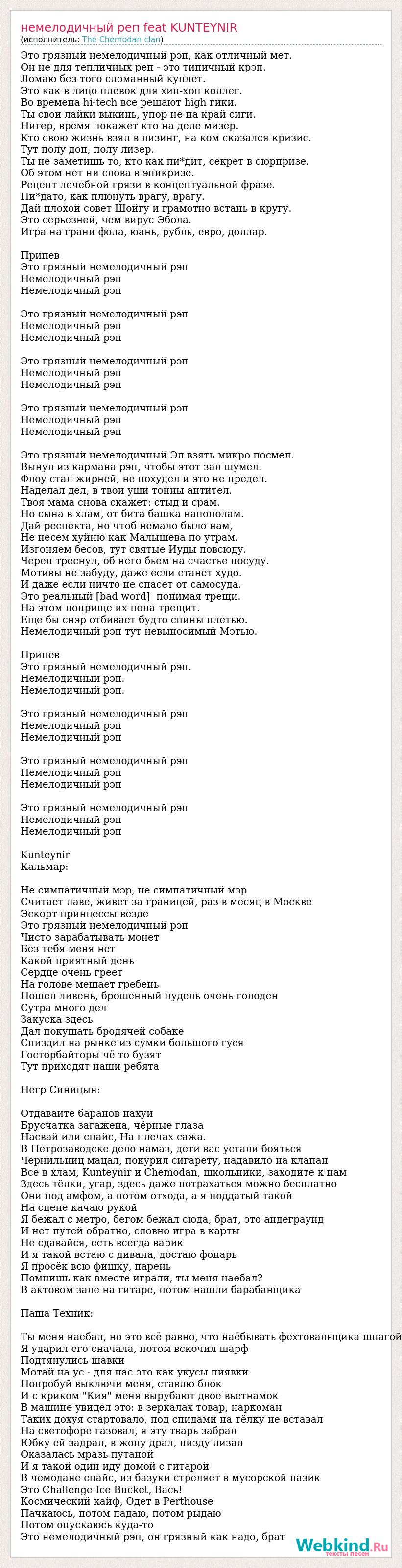 Это грязный немелодичный рэп, как отличный мет. Он не для тепличных реп - это типичный крэп. Ломаю без того сломанный куплет. Это как в лицо плевок для хип-хоп коллег. Во времена hi-tech все решают high гики. Ты свои лайки выкинь, упор не на край сиги. Нигер, время покажет кто на деле мизер. Кто свою жизнь взял в лизинг, на ком сказался кризис. Тут полу доп, полу лизер. Ты не заметишь то, кто как пи*дит, секрет в сюрпризе. Об этом нет ни слова в эпикризе. Рецепт лечебной грязи в концептуальной фразе. Пи*дато, как плюнуть врагу, врагу. Дай плохой совет Шойгу и грамотно встань в кругу. Это серьезней, чем вирус Эбола. Игра на грани фола, юань, рубль, евро, доллар. Припев Это грязный немелодичный рэп Немелодичный рэп Немелодичный рэп Это грязный немелодичный рэп Немелодичный рэп Немелодичный рэп Это грязный немелодичный рэп Немелодичный рэп Немелодичный рэп Это грязный немелодичный рэп Немелодичный рэп Немелодичный рэп Это грязный немелодичный Эл взять микро посмел. Вынул из кармана рэп, чтобы этот зал шумел. Флоу стал жирней, не похудел и это не предел. Наделал дел, в твои уши тонны антител. Твоя мама снова скажет: стыд и срам. Но сына в хлам, от бита башка напополам. Дай респекта, но чтоб немало было нам, Не несем хуйню как Малышева по утрам. Изгоняем бесов, тут святые Иуды повсюду. Череп треснул, об него бьем на счастье посуду. Мотивы не забуду, даже если станет худо. И даже если ничто не спасет от самосуда. Это реальный [bad word] понимая трещи. На этом поприще их попа трещит. Еще бы снэр отбивает будто спины плетью. Немелодичный рэп тут невыносимый Мэтью. Припев Это грязный немелодичный рэп. Немелодичный рэп. Немелодичный рэп. Это грязный немелодичный рэп Немелодичный рэп Немелодичный рэп Это грязный немелодичный рэп Немелодичный рэп Немелодичный рэп Это грязный немелодичный рэп Немелодичный рэп Немелодичный рэп Kunteynir Кальмар: Не симпатичный мэр, не симпатичный мэр Считает лаве, живет за границей, раз в месяц в Москве Эскорт принцессы везде Это грязный немелодичный рэп Чисто зарабатывать монет Без тебя меня нет Какой приятный день Сердце очень греет На голове мешает гребень Пошел ливень, брошенный пудель очень голоден Сутра много дел Закуска здесь Дал покушать бродячей собаке Спиздил на рынке из сумки большого гуся Госторбайторы чё то бузят Тут приходят наши ребята Негр Синицын: Отдавайте баранов нахуй Брусчатка загажена, чёрные глаза Насвай или спайс, На плечах сажа. В Петрозаводске дело намаз, дети вас устали бояться Чернильниц мацал, покурил сигарету, надавило на клапан Все в хлам, Kunteynir и Chemodan, школьники, заходите к нам Здесь тёлки, угар, здесь даже потрахаться можно бесплатно Они под амфом, а потом отхода, а я поддатый такой На сцене качаю рукой Я бежал с метро, бегом бежал сюда, брат, это андеграунд И нет путей обратно, словно игра в карты Не сдавайся, есть всегда варик И я такой встаю с дивана, достаю фонарь Я просёк всю фишку, парень Помнишь как вместе играли, ты меня наебал? В актовом зале на гитаре, потом нашли барабанщика Паша Техник: Ты меня наебал, но это всё равно, что наёбывать фехтовальщика шпагой Я ударил его сначала, потом вскочил шарф Подтянулись шавки Мотай на ус - для нас это как укусы пиявки Попробуй выключи меня, ставлю блок И с криком "Кия" меня вырубают двое вьетнамок В машине увидел это: в зеркалах товар, наркоман Таких дохуя стартовало, под сп