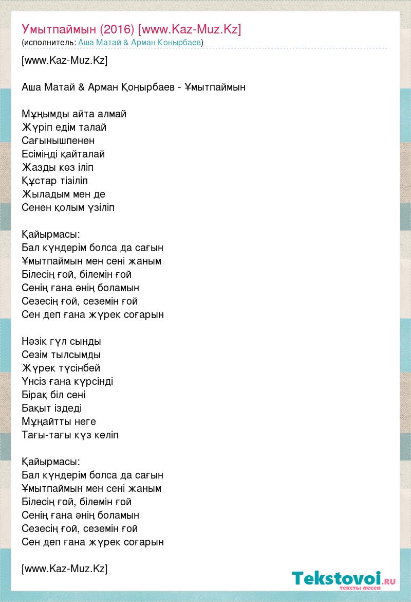 [www.Kaz-Muz.Kz] Аша Матай & Арман Қоңырбаев - Ұмытпаймын Мұңымды айта алмай Жүріп едім талай Сағынышпенен Есіміңді қайталай Жазды көз іліп Құстар тізіліп Жыладым мен де Сенен қолым үзіліп Қайырмасы: Бал күндерім болса да сағын Ұмытпаймын мен сені жаным Білесің ғой, білемін ғой Сенің ғана әнің боламын Сезесің ғой, сеземін ғой Сен деп ғана жүрек соғарын Нәзік гүл сынды Сезім тылсымды Жүрек түсінбей Үнсіз ғана күрсінді Бірақ біл сені Бақыт іздеді Мұңайтты неге Тағы-тағы күз келіп Қайырмасы: Бал күндерім болса да сағын Ұмытпаймын мен сені жаным Білесің ғой, білемін ғой Сенің ғана әнің боламын Сезесің ғой, сеземін ғой Сен деп ғана жүрек соғарын [www.Kaz-Muz.Kz]