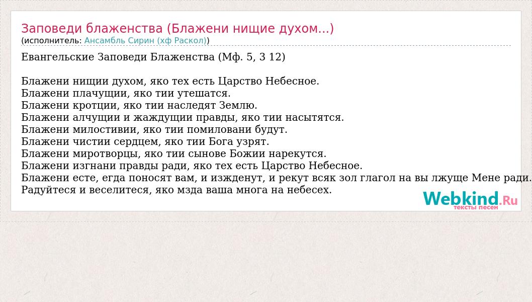 А как ты думаешь, о чем песня "Заповеди блаженства (Блажени нищие духом...)" ?