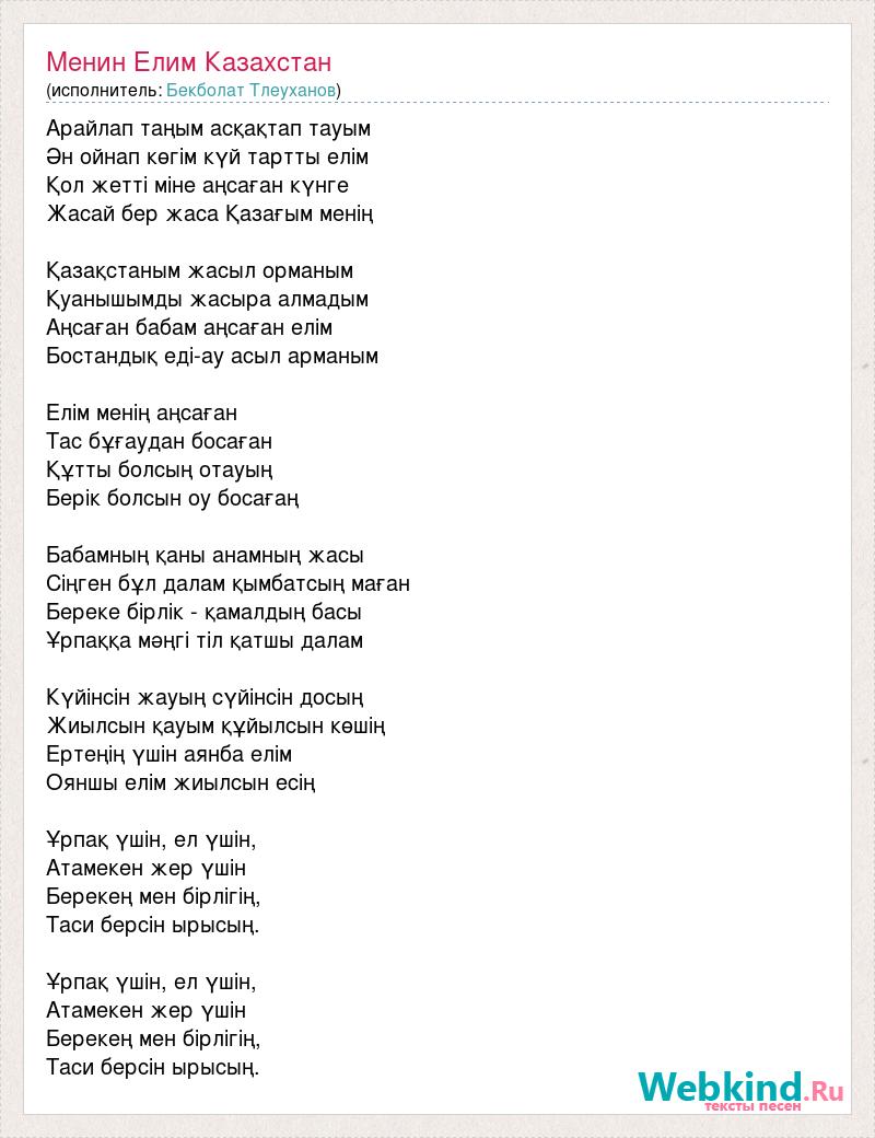 Арайлап таңым асқақтап тауым Ән ойнап көгім күй тартты елім Қол жетті міне аңсаған күнге Жасай бер жаса Қазағым менің Қазақстаным жасыл орманым Қуанышымды жасыра алмадым Аңсаған бабам аңсаған елім Бостандық еді-ау асыл арманым Елім менің аңсаған Тас бұғаудан босаған Құтты болсың отауың Берік болсын оу босағаң Бабамның қаны анамның жасы Сіңген бұл далам қымбатсың маған Береке бірлік - қамалдың басы Ұрпаққа мәңгі тіл қатшы далам Күйінсін жауың сүйінсін досың Жиылсын қауым құйылсын көшің Ертеңің үшін аянба елім Ояншы елім жиылсын есің Ұрпақ үшін, ел үшін, Атамекен жер үшін Берекең мен бірлігің, Таси берсін ырысың. Ұрпақ үшін, ел үшін, Атамекен жер үшін Берекең мен бірлігің, Таси берсін ырысың.