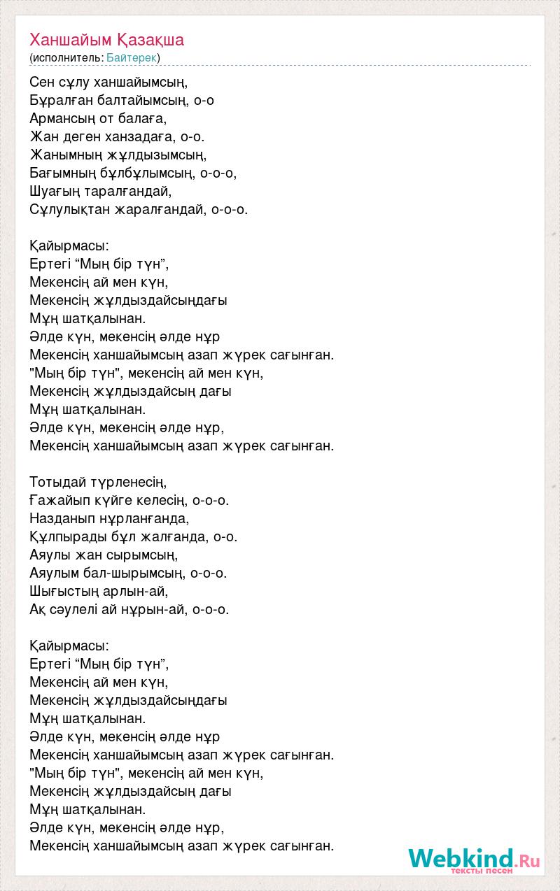 Сен сұлу ханшайымсың, Бұралған балтайымсың, о-о Армансың от балаға, Жан деген ханзадаға, о-о. Жанымның жұлдызымсың, Бағымның бұлбұлымсың, о-о-о, Шуағың таралғандай, Сұлулықтан жаралғандай, о-о-о. Қайырмасы: Ертегi “Мың бiр түн”, Мекенсiң ай мен күн, Мекенсiң жұлдыздайсыңдағы Мұң шатқалынан. Әлде күн, мекенсiң әлде нұр Мекенсiң ханшайымсың азап жүрек сағынған. "Мың бiр түн", мекенсiң ай мен күн, Мекенсiң жұлдыздайсың дағы Мұң шатқалынан. Әлде күн, мекенсiң әлде нұр, Мекенсiң ханшайымсың азап жүрек сағынған. Тотыдай түрленесiң, Ғажайып күйге келесiң, о-о-о. Назданып нұрланғанда, Құлпырады бұл жалғанда, о-о. Аяулы жан сырымсың, Аяулым бал-шырымсың, о-о-о. Шығыстың арлын-ай, Ақ сәулелi ай нұрын-ай, о-о-о. Қайырмасы: Ертегi “Мың бiр түн”, Мекенсiң ай мен күн, Мекенсiң жұлдыздайсыңдағы Мұң шатқалынан. Әлде күн, мекенсiң әлде нұр Мекенсiң ханшайымсың азап жүрек сағынған. "Мың бiр түн", мекенсiң ай мен күн, Мекенсiң жұлдыздайсың дағы Мұң шатқалынан. Әлде күн, мекенсiң әлде нұр, Мекенсiң ханшайымсың азап жүрек сағынған.