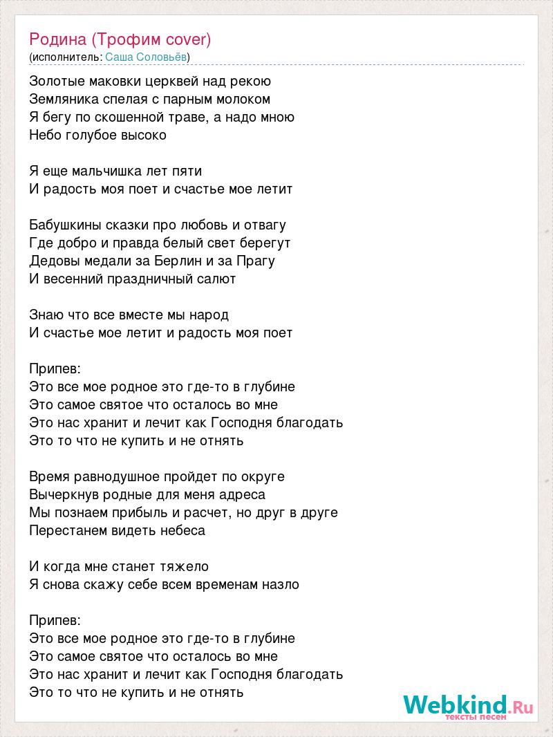 Золотые маковки церквей над рекою Земляника спелая с парным молоком Я бегу по скошенной траве, а надо мною Небо голубое высоко Я еще мальчишка лет пяти И радость моя поет и счастье мое летит Бабушкины сказки про любовь и отвагу Где добро и правда белый свет берегут Дедовы медали за Берлин и за Прагу И весенний праздничный салют Знаю что все вместе мы народ И счастье мое летит и радость моя поет Припев: Это все мое родное это где-то в глубине Это самое святое что осталось во мне Это нас хранит и лечит как Господня благодать Это то что не купить и не отнять Время равнодушное пройдет по округе Вычеркнув родные для меня адреса Мы познаем прибыль и расчет, но друг в друге Перестанем видеть небеса И когда мне станет тяжело Я снова скажу себе всем временам назло Припев: Это все мое родное это где-то в глубине Это самое святое что осталось во мне Это нас хранит и лечит как Господня благодать Это то что не купить и не отнять