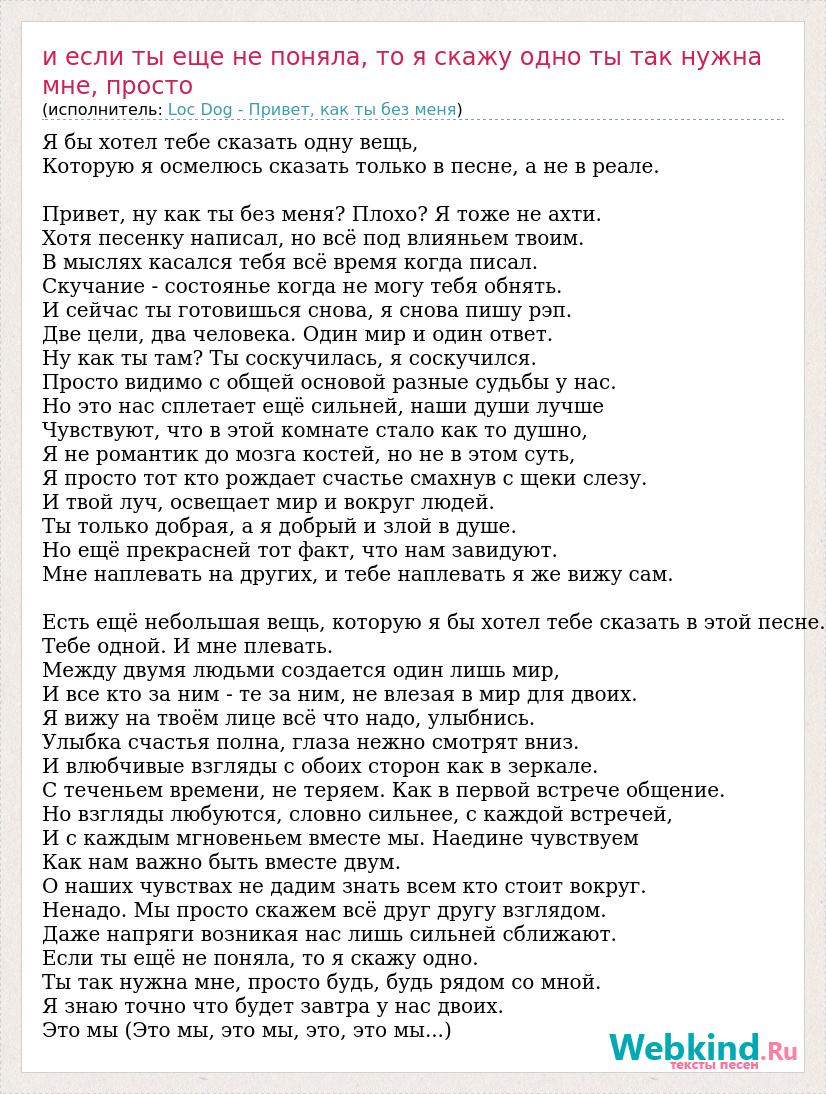 Главная→Исполнители→Loc Dog - Привет, как ты без меня→И если ты еще не поняла, то я скажу одно ты так нужна мне, просто