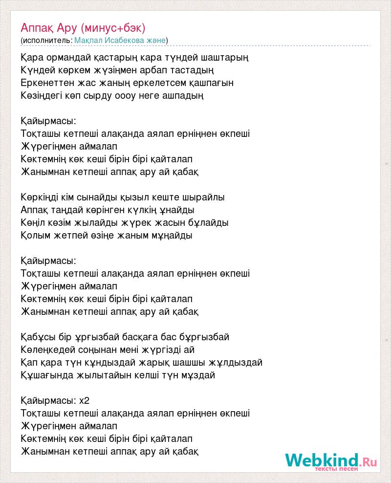 Қара ормандай қастарың кара түндей шаштарың Күндей көркем жүзіңмен арбап тастадың Еркенеттен жас жаның еркелетсем қашпағын Көзіңдегі көп сырду оооу неге ашпадың Қайырмасы: Тоқташы кетпеші алақанда аялап ерніңнен өкпеші Жүрегіңмен аймалап Көктемнің көк кеші бірін бірі қайталап Жанымнан кетпеші аппақ ару ай қабақ Көркіңді кім сынайды қызыл кеште шырайлы Аппақ таңдай көрінген күлкің ұнайды Көңіл көзім жылайды жүрек жасын бұлайды Қолым жетпей өзіңе жаным мұңайды Қайырмасы: Тоқташы кетпеші алақанда аялап ерніңнен өкпеші Жүрегіңмен аймалап Көктемнің көк кеші бірін бірі қайталап Жанымнан кетпеші аппақ ару ай қабақ Қабұсы бір ұрғызбай басқаға бас бұрғызбай Көлеңкедей соңынан мені жүргізді ай Қап қара түн кұндыздай жарық шашшы жұлдыздай Құшағында жылытайын келші түн мұздай Қайырмасы: х2 Тоқташы кетпеші алақанда аялап ерніңнен өкпеші Жүрегіңмен аймалап Көктемнің көк кеші бірін бірі қайталап Жанымнан кетпеші аппақ ару ай қабақ