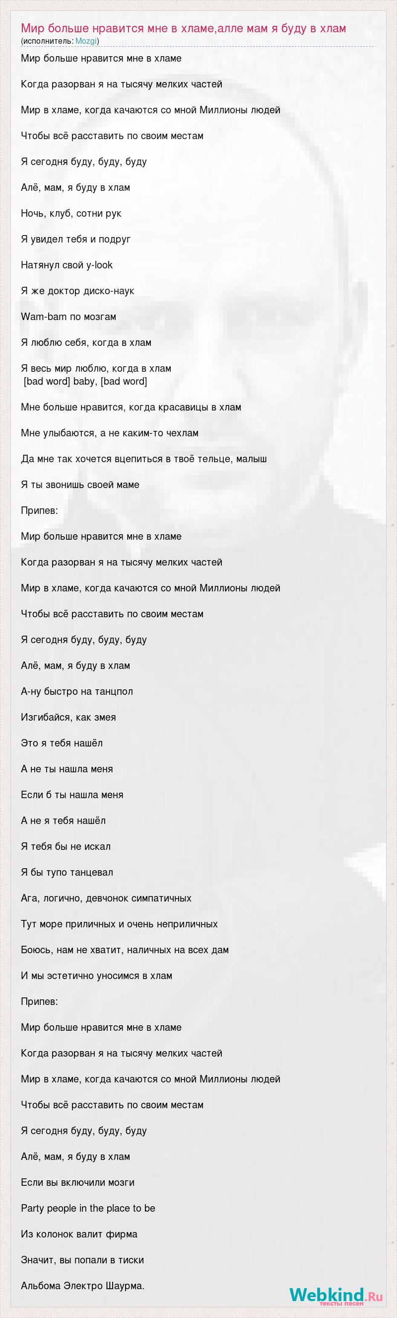 Мир больше нравится мне в хламе Когда разорван я на тысячу мелких частей Мир в хламе, когда качаются со мной Миллионы людей Чтобы всё расставить по своим местам Я сегодня буду, буду, буду Алё, мам, я буду в хлам Ночь, клуб, сотни рук Я увидел тебя и подруг Натянул свой y-look Я же доктор диско-наук Wam-bam по мозгам Я люблю себя, когда в хлам Я весь мир люблю, когда в хлам [bad word] baby, [bad word] Мне больше нравится, когда красавицы в хлам Мне улыбаются, а не каким-то чехлам Да мне так хочется вцепиться в твоё тельце, малыш Я ты звонишь своей маме Припев: Мир больше нравится мне в хламе Когда разорван я на тысячу мелких частей Мир в хламе, когда качаются со мной Миллионы людей Чтобы всё расставить по своим местам Я сегодня буду, буду, буду Алё, мам, я буду в хлам А-ну быстро на танцпол Изгибайся, как змея Это я тебя нашёл А не ты нашла меня Если б ты нашла меня А не я тебя нашёл Я тебя бы не искал Я бы тупо танцевал Ага, логично, девчонок симпатичных Тут море приличных и очень неприличных Боюсь, нам не хватит, наличных на всех дам И мы эстетично уносимся в хлам Припев: Мир больше нравится мне в хламе Когда разорван я на тысячу мелких частей Мир в хламе, когда качаются со мной Миллионы людей Чтобы всё расставить по своим местам Я сегодня буду, буду, буду Алё, мам, я буду в хлам Если вы включили мозги Party people in the place to be Из колонок валит фирма Значит, вы попали в тиски Альбома Электро Шаурма.