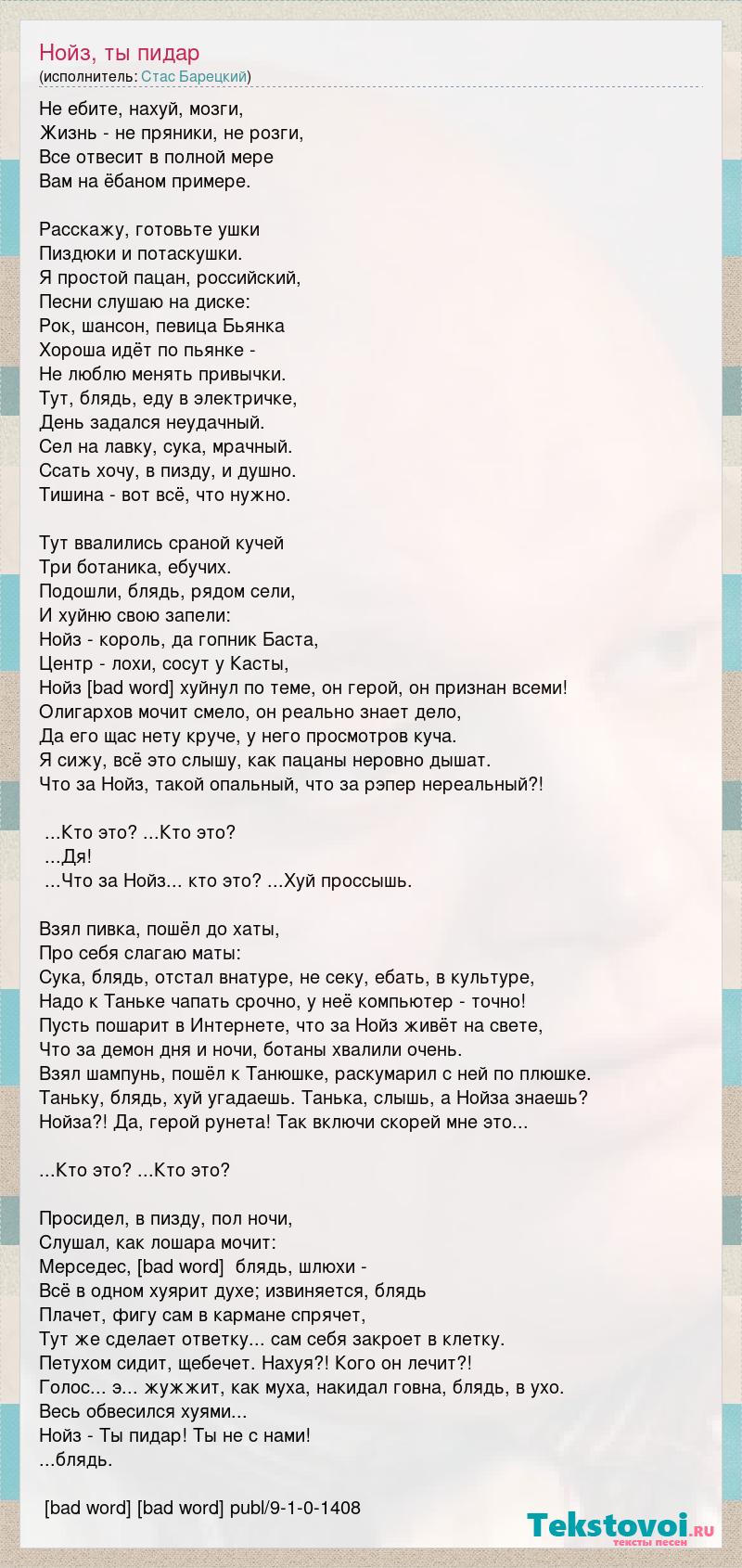 Не ебите, нахуй, мозги, Жизнь - не пряники, не розги, Все отвесит в полной мере Вам на ёбаном примере. Расскажу, готовьте ушки Пиздюки и потаскушки. Я простой пацан, российский, Песни слушаю на диске: Рок, шансон, певица Бьянка Хороша идёт по пьянке - Не люблю менять привычки. Тут, блядь, еду в электричке, День задался неудачный. Сел на лавку, сука, мрачный. Ссать хочу, в пизду, и душно. Тишина - вот всё, что нужно. Тут ввалились сраной кучей Три ботаника, ебучих. Подошли, блядь, рядом сели, И хуйню свою запели: Нойз - король, да гопник Баста, Центр - лохи, сосут у Касты, Нойз [bad word] хуйнул по теме, он герой, он признан всеми! Олигархов мочит смело, он реально знает дело, Да его щас нету круче, у него просмотров куча. Я сижу, всё это слышу, как пацаны неровно дышат. Что за Нойз, такой опальный, что за рэпер нереальный?! ...Кто это? ...Кто это? ...Дя! ...Что за Нойз... кто это? ...Хуй проссышь. Взял пивка, пошёл до хаты, Про себя слагаю маты: Сука, блядь, отстал внатуре, не секу, ебать, в культуре, Надо к Таньке чапать срочно, у неё компьютер - точно! Пусть пошарит в Интернете, что за Нойз живёт на свете, Что за демон дня и ночи, ботаны хвалили очень. Взял шампунь, пошёл к Танюшке, раскумарил с ней по плюшке. Таньку, блядь, хуй угадаешь. Танька, слышь, а Нойза знаешь? Нойза?! Да, герой рунета! Так включи скорей мне это... ...Кто это? ...Кто это? Просидел, в пизду, пол ночи, Слушал, как лошара мочит: Мерседес, [bad word] блядь, шлюхи - Всё в одном хуярит духе; извиняется, блядь Плачет, фигу сам в кармане спрячет, Тут же сделает ответку... сам себя закроет в клетку. Петухом сидит, щебечет. Нахуя?! Кого он лечит?! Голос... э... жужжит, как муха, накидал говна, блядь, в ухо. Весь обвесился хуями... Нойз - Ты пидар! Ты не с нами! ...блядь. [bad word] [bad word] publ/9-1-0-1408