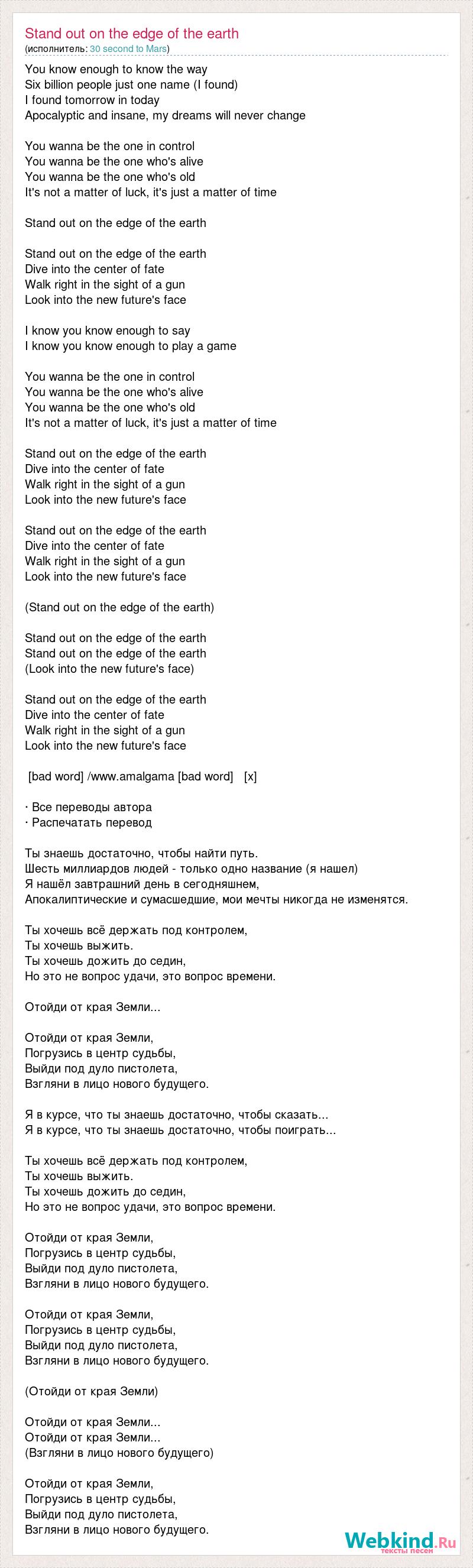 You know enough to know the way Six billion people just one name (I found) I found tomorrow in today Apocalyptic and insane, my dreams will never change You wanna be the one in control You wanna be the one who's alive You wanna be the one who's old It's not a matter of luck, it's just a matter of time Stand out on the edge of the earth Stand out on the edge of the earth Dive into the center of fate Walk right in the sight of a gun Look into the new future's face I know you know enough to say I know you know enough to play a game You wanna be the one in control You wanna be the one who's alive You wanna be the one who's old It's not a matter of luck, it's just a matter of time Stand out on the edge of the earth Dive into the center of fate Walk right in the sight of a gun Look into the new future's face Stand out on the edge of the earth Dive into the center of fate Walk right in the sight of a gun Look into the new future's face (Stand out on the edge of the earth) Stand out on the edge of the earth Stand out on the edge of the earth (Look into the new future's face) Stand out on the edge of the earth Dive into the center of fate Walk right in the sight of a gun Look into the new future's face [bad word] /www.amalgama [bad word] [x] · Все переводы автора · Распечатать перевод Ты знаешь достаточно, чтобы найти путь. Шесть миллиардов людей - только одно название (я нашел) Я нашёл завтрашний день в сегодняшнем, Апокалиптические и сумасшедшие, мои мечты никогда не изменятся. Ты хочешь всё держать под контролем, Ты хочешь выжить. Ты хочешь дожить до седин, Но это не вопрос удачи, это вопрос времени. Отойди от края Земли... Отойди от края Земли, Погрузись в центр судьбы, Выйди под дуло пистолета, Взгляни в лицо нового будущего. Я в курсе, что ты знаешь достаточно, чтобы сказать... Я в курсе, что ты знаешь достаточно, чтобы поиграть... Ты хочешь всё держать под контролем, Ты хочешь выжить. Ты хочешь дожить до седин, Но это не вопрос удачи, это вопрос времени. Отойди от края Земли, Погрузись в центр судьбы, Выйди под дуло пистолета, Взгляни в лицо нового будущего. Отойди от края Земли, Погрузись в центр судьбы, Выйди под дуло пистолета, Взгляни в лицо нового будущего. (Отойди от края Земли) Отойди от края Земли... Отойди от края Земли... (Взгляни в лицо нового будущего) Отойди от края Земли, Погрузись в центр судьбы, Выйди под дуло пистолета, Взгляни в лицо нового будущего.