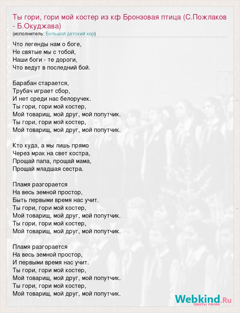 Что легенды нам о боге, Не святые мы с тобой, Наши боги - те дороги, Что ведут в последний бой. Барабан старается, Трубач играет сбор, И нет среди нас белоручек. Ты гори, гори мой костер, Мой товарищ, мой друг, мой попутчик. Ты гори, гори мой костер, Мой товарищ, мой друг, мой попутчик. Кто куда, а мы лишь прямо Через мрак на свет костра, Прощай папа, прощай мама, Прощай младшая сестра. Пламя разгорается На весь земной простор, Быть первыми время нас учит. Ты гори, гори мой костер, Мой товарищ, мой друг, мой попутчик. Ты гори, гори мой костер, Мой товарищ, мой друг, мой попутчик. Пламя разгорается На весь земной простор, И первыми время нас учит. Ты гори, гори мой костер, Мой товарищ, мой друг, мой попутчик. Ты гори, гори мой костер, Мой товарищ, мой друг, мой попутчик.