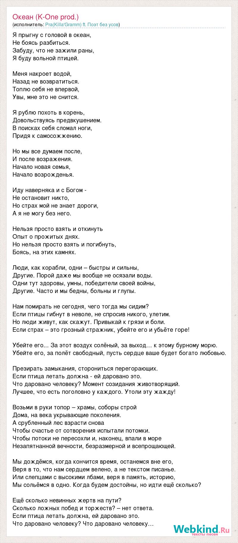 Я прыгну с головой в океан, Не боясь разбиться. Забуду, что не зажили раны, Я буду вольной птицей. Меня накроет водой, Назад не возвратиться. Топлю себя не впервой, Увы, мне это не снится. Я рублю похоть в корень, Довольствуясь предвкушением. В поисках себя сломал ноги, Придя к самосожжению. Но мы все думаем после, И после возражения. Начало новая семья, Начало возрожденья. Иду наверняка и с Богом - Не остановит никто, Но страх мой не знает дороги, А я не могу без него. Нельзя просто взять и откинуть Опыт о прожитых днях. Но нельзя просто взять и погибнуть, Боясь, на этих камнях. Люди, как корабли, одни – быстры и сильны, Другие. Порой даже мы вообще не осязали воды. Одни тут здоровы, умны, победители своей войны, Другие. Часто и мы бедны, больны и глупы. Нам помирать не сегодня, чего тогда мы сидим? Если птицы гибнут в неволе, не спросив никого, улетим. Но люди живут, как скажут. Привыкай к грязи и боли. Если страх – это грозный стражник, убейте его и убьёте горе! Убейте его... За этот воздух солёный, за выход… к этому бурному морю. Убейте его, за полёт свободный, пусть сердце ваше будет богато любовью. Презирать замыкания, сторониться перегорающих. Если птица летать должна - ей даровано это. Что даровано человеку? Момент созидания животворящий. Лучшее, что есть поголовно у каждого. Утоли эту жажду! Возьми в руки топор – храмы, соборы строй Дома, на века укрывающие поколения. А срубленный лес взрасти снова Чтобы счастье от сотворения испытали потомки. Чтобы потоки не пересохли и, наконец, впали в море Незапятнанной вечности, безразмерной и всепрощающей. Мы дождёмся, когда кончится время, останемся вне его, Веря в то, что нам сердцем велено, а не текстом писанье. Или слепцами с высокими лбами, веря в память, историю, Мы сольёмся в одно. Когда будем достойны, но идти ещё сколько? Ещё сколько невинных жертв на пути? Сколько ложных побед и торжеств? – нет ответа. Если птица летать должна, ей даровано это. Что даровано человеку? Что даровано человеку…