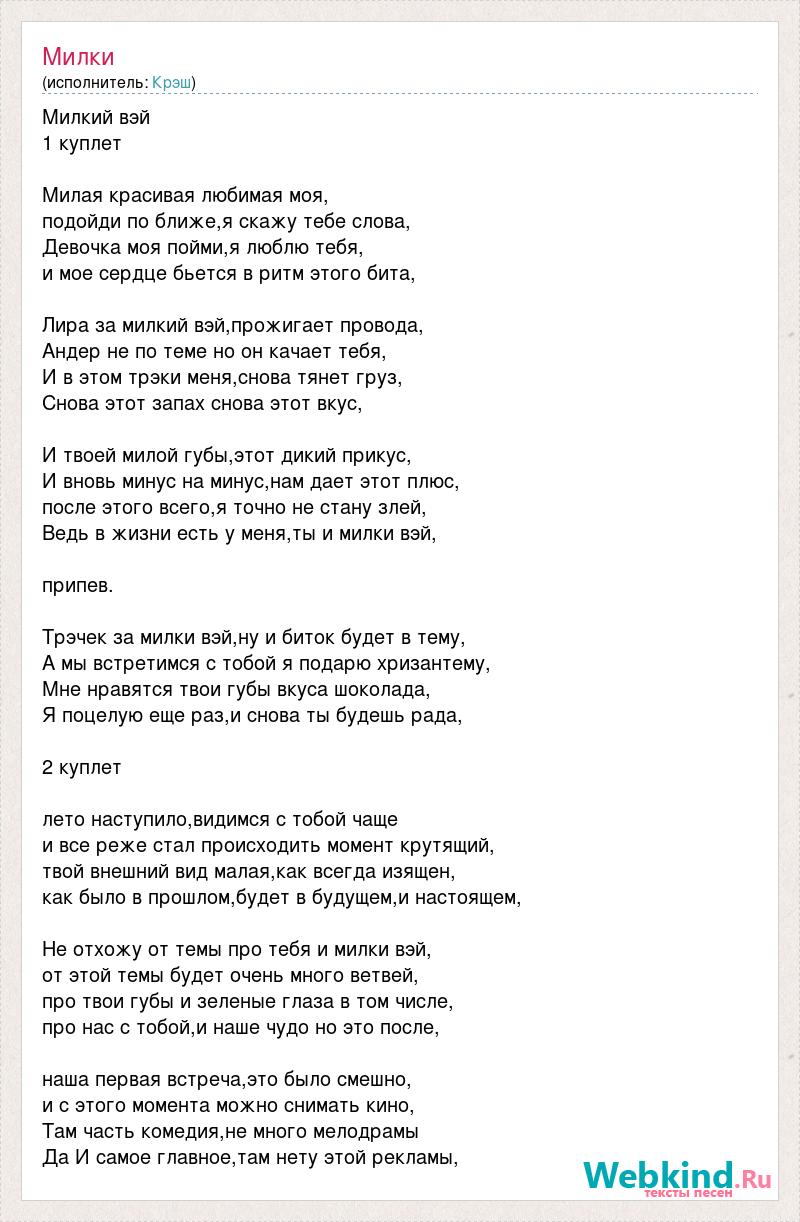 Милкий вэй 1 куплет Милая красивая любимая моя, подойди по ближе,я скажу тебе слова, Девочка моя пойми,я люблю тебя, и мое сердце бьется в ритм этого бита, Лира за милкий вэй,прожигает провода, Андер не по теме но он качает тебя, И в этом трэки меня,снова тянет груз, Снова этот запах снова этот вкус, И твоей милой губы,этот дикий прикус, И вновь минус на минус,нам дает этот плюс, после этого всего,я точно не стану злей, Ведь в жизни есть у меня,ты и милки вэй, припев. Трэчек за милки вэй,ну и биток будет в тему, А мы встретимся с тобой я подарю хризантему, Мне нравятся твои губы вкуса шоколада, Я поцелую еще раз,и снова ты будешь рада, 2 куплет лето наступило,видимся с тобой чаще и все реже стал происходить момент крутящий, твой внешний вид малая,как всегда изящен, как было в прошлом,будет в будущем,и настоящем, Не отхожу от темы про тебя и милки вэй, от этой темы будет очень много ветвей, про твои губы и зеленые глаза в том числе, про нас с тобой,и наше чудо но это после, наша первая встреча,это было смешно, и с этого момента можно снимать кино, Там часть комедия,не много мелодрамы Да И самое главное,там нету этой рекламы,