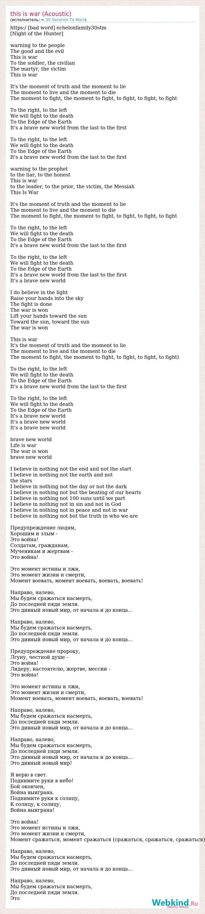 https:/ [bad word] echelonfamily30stm [Night of the Hunter] warning to the people The good and the evil This is war To the soldier, the civilian The martyr, the victim This is war It's the moment of truth and the moment to lie The moment to live and the moment to die The moment to fight, the moment to fight, to fight, to fight, to fight To the right, to the left We will fight to the death To the Edge of the Earth It's a brave new world from the last to the first To the right, to the left We will fight to the death To the Edge of the Earth It's a brave new world from the last to the first warning to the prophet to the liar, to the honest This is war to the leader, to the prior, the victim, the Messiah This Is War It's the moment of truth and the moment to lie The moment to live and the moment to die The moment to fight, the moment to fight, to fight, to fight, to fight To the right, to the left We will fight to the death To the Edge of the Earth It's a brave new world from the last to the first To the right, to the left We will fight to the death To the Edge of the Earth It's a brave new world from the last to the first It's a brave new world I do believe in the light Raise your hands into the sky The fight is done The war is won Lift your hands toward the sun Toward the sun, toward the sun The war is won This is war It's the moment of truth and the moment to lie The moment to live and the moment to die The moment to fight, the moment to fight, to fight, to fight, to fight) To the right, to the left We will fight to the death To the Edge of the Earth It's a brave new world from the last to the first To the right, to the left We will fight to the death To the Edge of the Earth It's a brave new world It's a brave new world It's a brave new world brave new world Life is war The war is won brave new world I believe in nothing not the end and not the start I believe in nothing not the earth and not the stars I believe in nothing not the day or not the dark I believe in nothing not but the beating of our hearts I believe in nothing not 100 suns until we part I believe in nothing not in sin and not in God I believe in nothing not in peace and not in war I believe in nothing not but the truth in who we are Предупреждение людям, Хорошим и злым - Это война! Солдатам, гражданам, Мученикам и жертвам - Это война! Это момент истины и лжи, Это момент жизни и смерти, Момент воевать, момент воевать, воевать, воевать! Направо, налево, Мы будем сражаться насмерть, До последней пяди земли. Это дивный новый мир, от начала и до конца... Направо, налево, Мы будем сражаться насмерть, До последней пяди земли. Это дивный новый мир, от начала и до конца... Предупреждение пророку, Лгуну, честной душе - Это война! Лидеру, настоятелю, жертве, мессии - Это война! Это момент истины и лжи, Это момент жизни и смерти, Момент воевать, момент воевать, воевать, воевать! Направо, налево, Мы будем сражаться насмерть, До последней пяди земли. Это дивный новый мир, от начала и до конца... Направо, налево, Мы будем сражаться насмерть, До последней пяди земли. Это дивный новый мир, от начала и до конца... Это дивный новый мир! Я верю в свет. Поднимите руки в небо! Бой окончен, Война выиграна. Поднимите руки к солнцу, К солнцу, к солнцу, Война выиграна! Это война! Это момент истины и лжи, Это момент жизни и смерти, Момент сражаться, момент сражаться (сражаться, сражаться, сражаться) Направо, налево, Мы будем сражаться насмерть, До последней пяди земли. Это дивный новый мир, от начала и до конца... Направо, налево, Мы будем сражаться насмерть, До последней пяди земли. Это