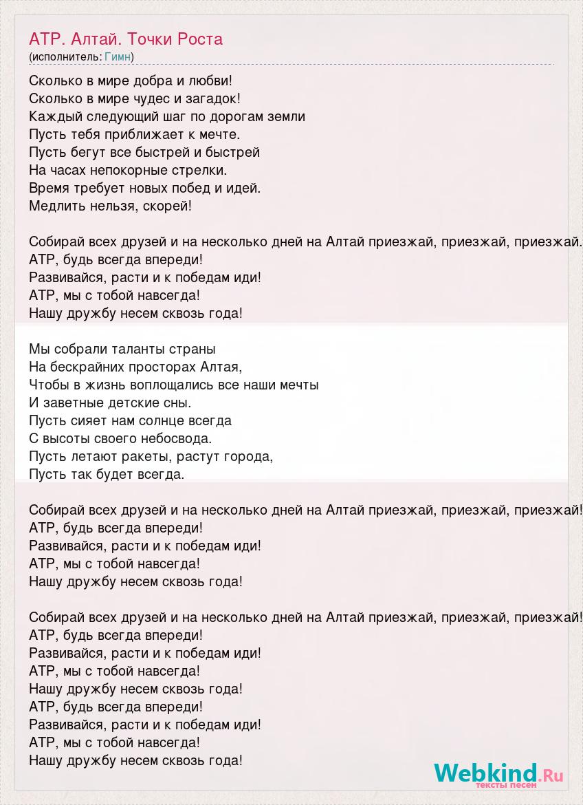 Сколько в мире добра и любви! Сколько в мире чудес и загадок! Каждый следующий шаг по дорогам земли Пусть тебя приближает к мечте. Пусть бегут все быстрей и быстрей На часах непокорные стрелки. Время требует новых побед и идей. Медлить нельзя, скорей! Собирай всех друзей и на несколько дней на Алтай приезжай, приезжай, приезжай. АТР, будь всегда впереди! Развивайся, расти и к победам иди! АТР, мы с тобой навсегда! Нашу дружбу несем сквозь года! Мы собрали таланты страны На бескрайних просторах Алтая, Чтобы в жизнь воплощались все наши мечты И заветные детские сны. Пусть сияет нам солнце всегда С высоты своего небосвода. Пусть летают ракеты, растут города, Пусть так будет всегда. Собирай всех друзей и на несколько дней на Алтай приезжай, приезжай, приезжай! АТР, будь всегда впереди! Развивайся, расти и к победам иди! АТР, мы с тобой навсегда! Нашу дружбу несем сквозь года! Собирай всех друзей и на несколько дней на Алтай приезжай, приезжай, приезжай! АТР, будь всегда впереди! Развивайся, расти и к победам иди! АТР, мы с тобой навсегда! Нашу дружбу несем сквозь года! АТР, будь всегда впереди! Развивайся, расти и к победам иди! АТР, мы с тобой навсегда! Нашу дружбу несем сквозь года!