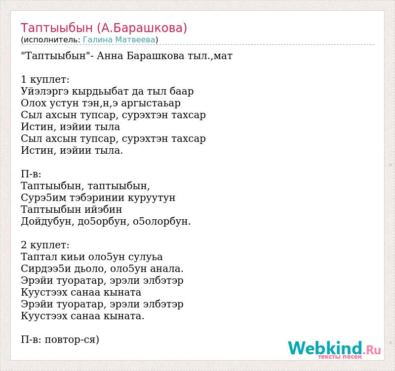 "Таптыыбын"- Анна Барашкова тыл.,мат 1 куплет: Уйэлэргэ кырдьыбат да тыл баар Олох устун тэн,н,э аргыстаьар Сыл ахсын тупсар, сурэхтэн тахсар Истин, иэйии тыла Сыл ахсын тупсар, сурэхтэн тахсар Истин, иэйии тыла. П-в: Таптыыбын, таптыыбын, Сурэ5им тэбэринии куруутун Таптыыбын ийэбин Дойдубун, до5орбун, о5олорбун. 2 куплет: Таптал киьи оло5ун сулуьа Сирдээ5и дьоло, оло5ун анала. Эрэйи туоратар, эрэли элбэтэр Куустээх санаа кыната Эрэйи туоратар, эрэли элбэтэр Куустээх санаа кыната. П-в: повтор-ся)