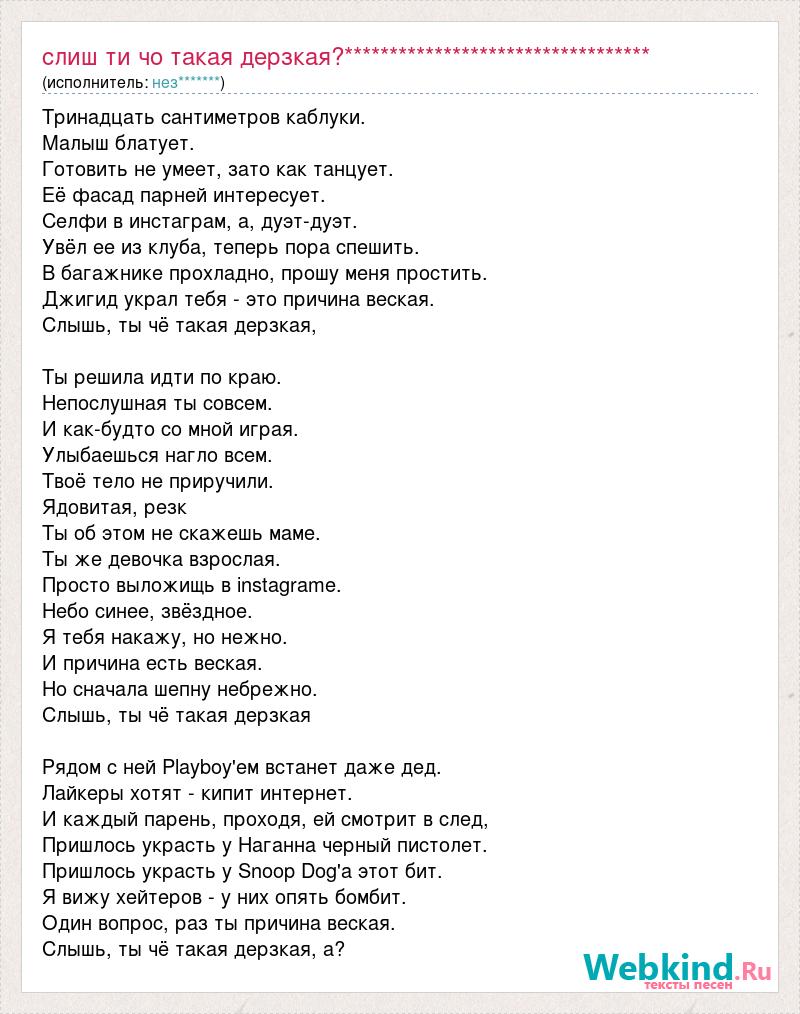 Тринадцать сантиметров каблуки. Малыш блатует. Готовить не умеет, зато как танцует. Её фасад парней интересует. Селфи в инстаграм, а, дуэт-дуэт. Увёл ее из клуба, теперь пора спешить. В багажнике прохладно, прошу меня простить. Джигид украл тебя - это причина веская. Слышь, ты чё такая дерзкая, Ты решила идти по краю. Непослушная ты совсем. И как-будто со мной играя. Улыбаешься нагло всем. Твоё тело не приручили. Ядовитая, резк Ты об этом не скажешь маме. Ты же девочка взрослая. Просто выложищь в instagramе. Небо синее, звёздное. Я тебя накажу, но нежно. И причина есть веская. Но сначала шепну небрежно. Слышь, ты чё такая дерзкая Рядом с ней Plаyboy'ем встанет даже дед. Лайкеры хотят - кипит интернет. И каждый парень, проходя, ей смотрит в след, Пришлось украсть у Наганна черный пистолет. Пришлось украсть у Snoop Dog'а этот бит. Я вижу хейтеров - у них опять бомбит. Один вопрос, раз ты причина веская. Слышь, ты чё такая дерзкая, а?