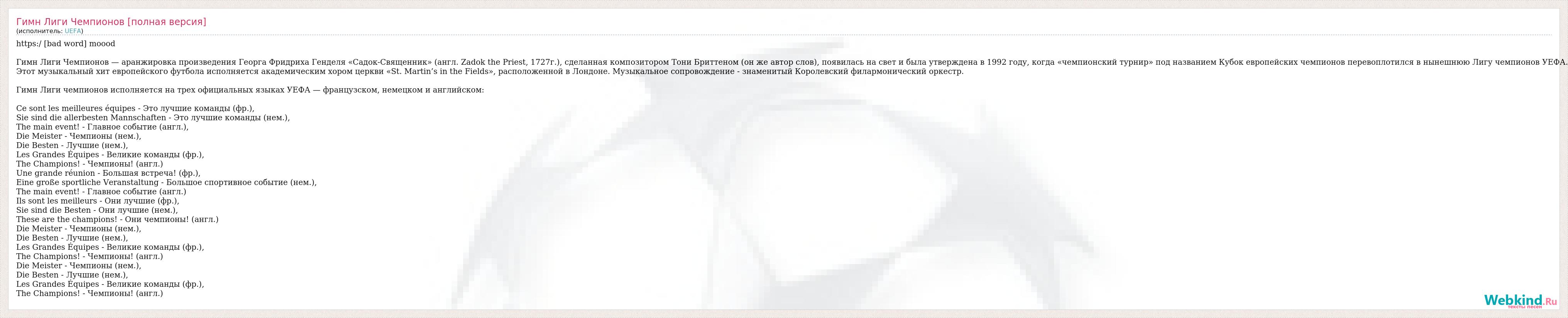 https:/ [bad word] moood Гимн Лиги Чемпионов — аранжировка произведения Георга Фридриха Генделя «Садок-Священник» (англ. Zadok the Priest, 1727г.), сделанная композитором Тони Бриттеном (он же автор слов), появилась на свет и была утверждена в 1992 году, когда «чемпионский турнир» под названием Кубок европейских чемпионов перевоплотился в нынешнюю Лигу чемпионов УЕФА. Этот музыкальный хит европейского футбола исполняется академическим хором церкви «St. Martin’s in the Fields», расположенной в Лондоне. Музыкальное сопровождение - знаменитый Королевский филармонический оркестр. Гимн Лиги чемпионов исполняется на трех официальных языках УЕФА — французском, немецком и английском: Ce sont les meilleures équipes - Это лучшие команды (фр.), Sie sind die allerbesten Mannschaften - Это лучшие команды (нем.), The main event! - Главное событие (англ.), Die Meister - Чемпионы (нем.), Die Besten - Лучшие (нем.), Les Grandes Équipes - Великие команды (фр.), The Champions! - Чемпионы! (англ.) Une grande réunion - Большая встреча! (фр.), Eine große sportliche Veranstaltung - Большое спортивное событие (нем.), The main event! - Главное событие (англ.) Ils sont les meilleurs - Они лучшие (фр.), Sie sind die Besten - Они лучшие (нем.), These are the champions! - Они чемпионы! (англ.) Die Meister - Чемпионы (нем.), Die Besten - Лучшие (нем.), Les Grandes Équipes - Великие команды (фр.), The Champions! - Чемпионы! (англ.) Die Meister - Чемпионы (нем.), Die Besten - Лучшие (нем.), Les Grandes Équipes - Великие команды (фр.), The Champions! - Чемпионы! (англ.)