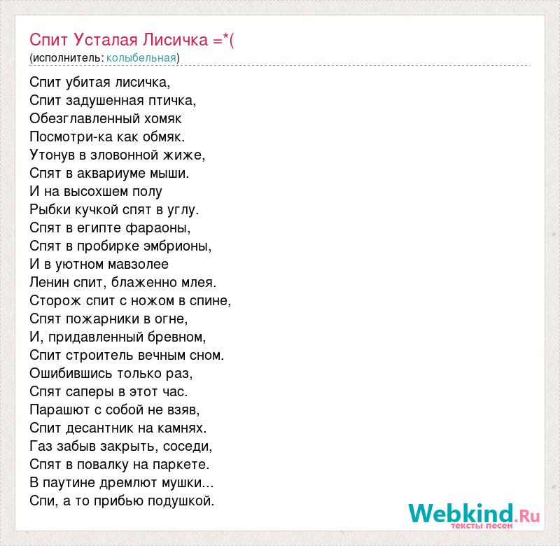Спит убитая лисичка, Спит задушенная птичка, Обезглавленный хомяк Посмотри-ка как обмяк. Утонув в зловонной жиже, Спят в аквариуме мыши. И на высохшем полу Рыбки кучкой спят в углу. Спят в египте фараоны, Спят в пробирке эмбрионы, И в уютном мавзолее Ленин спит, блаженно млея. Сторож спит с ножом в спине, Спят пожарники в огне, И, придавленный бревном, Спит строитель вечным сном. Ошибившись только раз, Спят саперы в этот час. Парашют с собой не взяв, Спит десантник на камнях. Газ забыв закрыть, соседи, Спят в повалку на паркете. В паутине дремлют мушки... Спи, а то прибью подушкой.