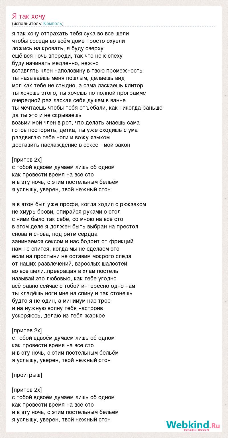 я так хочу оттрахать тебя сука во все щели чтобы соседи во всём доме просто охуели ложись на кровать, я буду сверху ещё вся ночь впереди, так что не к спеху буду начинать медленно, нежно вставлять член наполовину в твою промежность ты называешь меня пошлым, делаешь вид мол как тебе не стыдно, а сама ласкаешь клитор ты хочешь этого, ты хочешь по полной программе очередной раз лаская себя душем в ванне ты мечтаешь чтобы тебя отъебали, как никогда раньше да ты это и не скрываешь возьми мой член в рот, что делать знаешь сама готов поспорить, детка, ты уже сходишь с ума раздвигаю тебе ноги и вожу языком доставить наслаждение в сексе - мой закон [припев 2х] с тобой вдвоём думаем лишь об одном как провести время на все сто и в эту ночь, с этим постельным бельём я услышу, уверен, твой нежный стон я в этом был уже профи, когда ходил с рюкзаком не хмурь брови, опирайся руками о стол с ними было так себе, со мною на все сто в этом деле я должен быть выбран на престол снова и снова, под ритм сердца занимаемся сексом и нас бодрит от фрикций нам не спится, когда мы не сделаем это если на простыни не оставим мокрого следа от наших развлечений, взрослых шалостей во все щели..превращая в хлам постель называй это любовью, как тебе угодно всё равно сейчас с тобой интересно одно нам ты кладёшь ноги мне на спину и так стонешь будто я не один, а минимум нас трое и на нужную волну тебя настроив ускоряюсь, делаю из тебя жаркое [припев 2х] с тобой вдвоём думаем лишь об одном как провести время на все сто и в эту ночь, с этим постельным бельём я услышу, уверен, твой нежный стон [проигрыш] [припев 2х] с тобой вдвоём думаем лишь об одном как провести время на все сто и в эту ночь, с этим постельным бельём я услышу, уверен, твой нежный стон