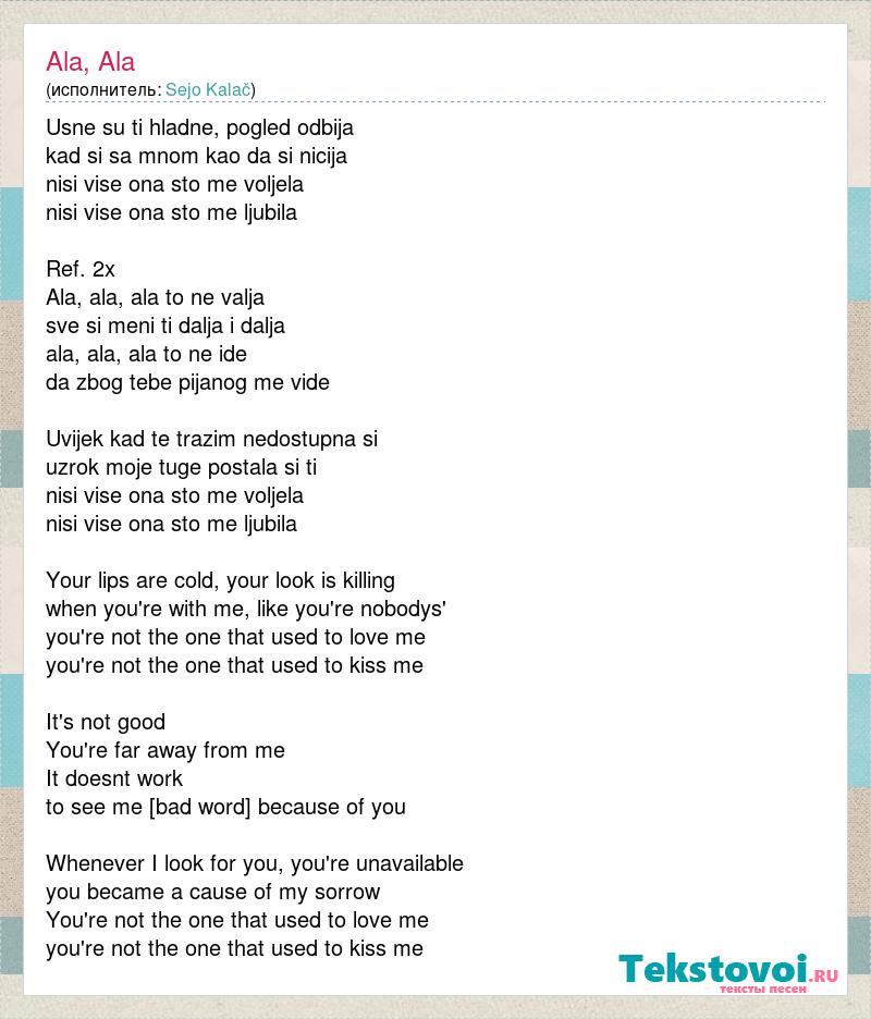 Usne su ti hladne, pogled odbija kad si sa mnom kao da si nicija nisi vise ona sto me voljela nisi vise ona sto me ljubila Ref. 2x Ala, ala, ala to ne valja sve si meni ti dalja i dalja ala, ala, ala to ne ide da zbog tebe pijanog me vide Uvijek kad te trazim nedostupna si uzrok moje tuge postala si ti nisi vise ona sto me voljela nisi vise ona sto me ljubila Your lips are cold, your look is killing when you're with me, like you're nobodys' you're not the one that used to love me you're not the one that used to kiss me It's not good You're far away from me It doesnt work to see me drunk because of you Whenever I look for you, you're unavailable you became a cause of my sorrow You're not the one that used to love me you're not the one that used to kiss me