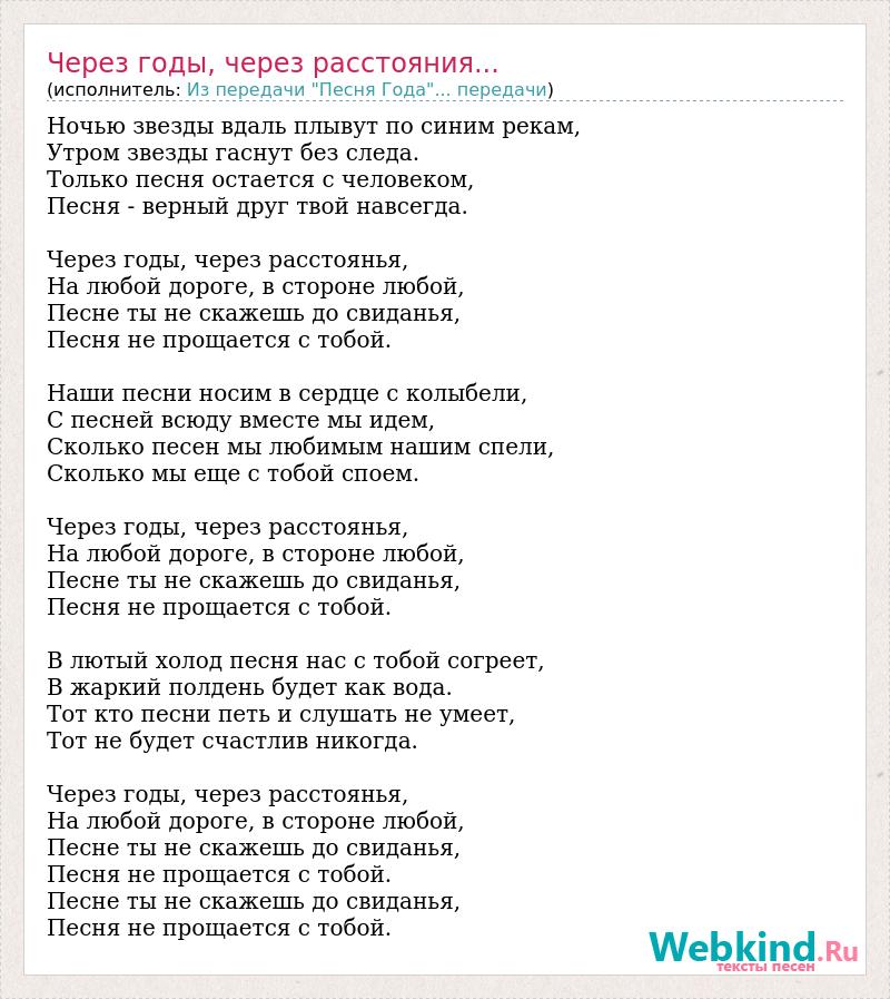 Ночью звезды вдаль плывут по синим рекам, Утром звезды гаснут без следа. Только песня остается с человеком, Песня - верный друг твой навсегда. Через годы, через расстоянья, На любой дороге, в стороне любой, Песне ты не скажешь до свиданья, Песня не прощается с тобой. Наши песни носим в сердце с колыбели, С песней всюду вместе мы идем, Сколько песен мы любимым нашим спели, Сколько мы еще с тобой споем. Через годы, через расстоянья, На любой дороге, в стороне любой, Песне ты не скажешь до свиданья, Песня не прощается с тобой. В лютый холод песня нас с тобой согреет, В жаркий полдень будет как вода. Тот кто песни петь и слушать не умеет, Тот не будет счастлив никогда. Через годы, через расстоянья, На любой дороге, в стороне любой, Песне ты не скажешь до свиданья, Песня не прощается с тобой. Песне ты не скажешь до свиданья, Песня не прощается с тобой.
