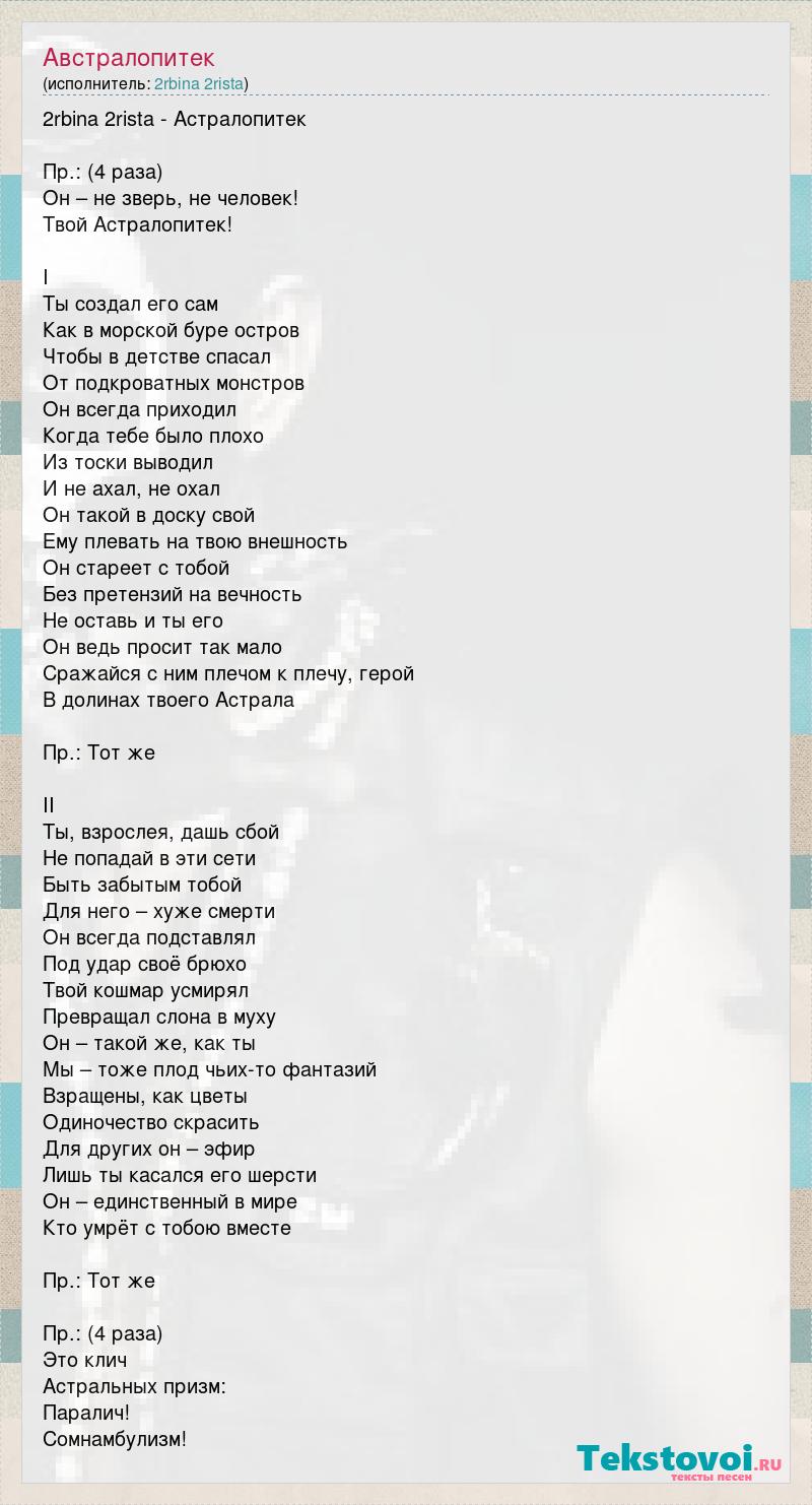 2rbina 2rista - Астралопитек Пр.: (4 раза) Он – не зверь, не человек! Твой Астралопитек! I Ты создал его сам Как в морской буре остров Чтобы в детстве спасал От подкроватных монстров Он всегда приходил Когда тебе было плохо Из тоски выводил И не ахал, не охал Он такой в доску свой Ему плевать на твою внешность Он стареет с тобой Без претензий на вечность Не оставь и ты его Он ведь просит так мало Сражайся с ним плечом к плечу, герой В долинах твоего Астрала Пр.: Тот же II Ты, взрослея, дашь сбой Не попадай в эти сети Быть забытым тобой Для него – хуже смерти Он всегда подставлял Под удар своё брюхо Твой кошмар усмирял Превращал слона в муху Он – такой же, как ты Мы – тоже плод чьих-то фантазий Взращены, как цветы Одиночество скрасить Для других он – эфир Лишь ты касался его шерсти Он – единственный в мире Кто умрёт с тобою вместе Пр.: Тот же Пр.: (4 раза) Это клич Астральных призм: Паралич! Сомнамбулизм!
