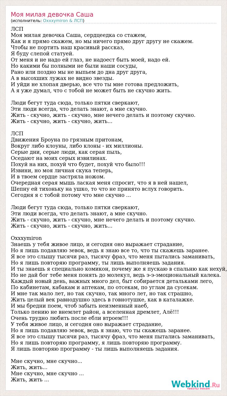 ЛСП Моя милая девочка Саша, сердцеедка со стажем, Как и я прямо скажем, но мы ничего прямо друг другу не скажем. Чтобы не портить наш красивый рассказ, Я буду слепой статуей. От меня и не надо ей глаз, не надоест быть моей, надо ей. Но какими бы полными не были наши сосуды, Рано или поздно мы не выпьем до дна друг друга, А в высохших лужах не видно звезды. И уйди не хлопая дверью, все что ты мне готова предложить, А я уже думал, что с тобой не может быть не скучно жить. Люди бегут туда сюда, только пятки сверкают, Эти люди всегда, что делать знают, а мне скучно. Жить - скучно, жить - скучно, мне нечего делать и поэтому скучно. Жить - скучно, жить - скучно, жить... ЛСП Движения Броуна по грязным притонам, Вокруг либо клоуны, либо клоны - их миллионы. Серые дни, серые люди, как серая пыль, Оседают на моих серых извилинах. Похуй на них, похуй что будет, похуй что было!!! Извини, но моя личная скука теперь, И в твоем сердце застряла ножом. Очередная серая мышь лаская меня спросит, что я в ней нашел, Шепну ей тихоньку на ушко, то что не принято вслух говорить. Сегодня я с тобой потому что мне скучно ... Люди бегут туда сюда, только пятки сверкают, Эти люди всегда, что делать знают, а мне скучно. Жить - скучно, жить - скучно, мне нечего делать и поэтому скучно. Жить - скучно, жить - скучно, жить... Oxxxymiron Знаешь у тебя живое лицо, и сегодня оно выражает страдание, Но я лишь подавляю зевок, ведь я знаю все то, что ты скажешь заранее. Я все это слышу тысячи раз, тысячу фраз, что меня пытались заманивать, Но я лишь повторяю программу, ты лишь выполняешь задания. И ты знаешь я специально комикон, почему же я пускаю в спальню как нехуй, Но не дай бог тебе меня понять до молекул, ведь э-э-эмоциональный калека. Каждый новый день, важных много дел, быт собирается детальками лего, По кабинетам, кабакам и аптекам, по отсекам, по углам да сусекам. И мне так мало лет, но так скучно, так много лет, но так страшно, Жить целый век равнодушно здесь в говнотушке, как в каталажке. И мы бредни поем, чтоб забыть неизменный наеб, Только пению не внемлет район, а вселенная дремлет, Алё!!! Очень трудно любить после ебли втроем!!! У тебя живое лицо, и сегодня оно выражает страдание, Но я лишь подавляю зевок, ведь я знаю, что ты скажешь заранее. Я все это слышу тысячи раз, тысячу фраз, что меня пытались заманивать, Но я лишь повторяю программу, я лишь повторяю программу. Я лишь повторяю программу - ты лишь выполняешь задания. Мне скучно, мне скучно... Жить, жить... Мне скучно, мне скучно ... Жить, жить ...
