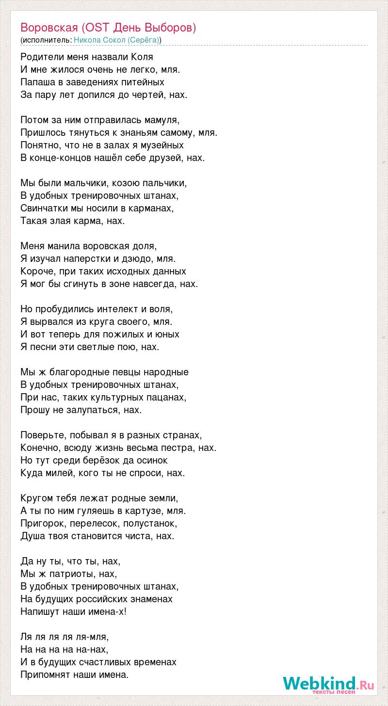 Родители меня назвали Коля И мне жилося очень не легко, мля. Папаша в заведениях питейных За пару лет допился до чертей, нах. Потом за ним отправилась мамуля, Пришлось тянуться к знаньям самому, мля. Понятно, что не в залах я музейных В конце-концов нашёл себе друзей, нах. Мы были мальчики, козою пальчики, В удобных тренировочных штанах, Свинчатки мы носили в карманах, Такая злая карма, нах. Меня манила воровская доля, Я изучал наперстки и дзюдо, мля. Короче, при таких исходных данных Я мог бы сгинуть в зоне навсегда, нах. Но пробудились интелект и воля, Я вырвался из круга своего, мля. И вот теперь для пожилых и юных Я песни эти светлые пою, нах. Мы ж благородные певцы народные В удобных тренировочных штанах, При нас, таких культурных пацанах, Прошу не залупаться, нах. Поверьте, побывал я в разных странах, Конечно, всюду жизнь весьма пестра, нах. Но тут среди берёзок да осинок Куда милей, кого ты не спроси, нах. Кругом тебя лежат родные земли, А ты по ним гуляешь в картузе, мля. Пригорок, перелесок, полустанок, Душа твоя становится чиста, нах. Да ну ты, что ты, нах, Мы ж патриоты, нах, В удобных тренировочных штанах, На будущих российских знаменах Напишут наши имена-х! Ля ля ля ля ля-мля, На на на на на-нах, И в будущих счастливых временах Припомнят наши имена.