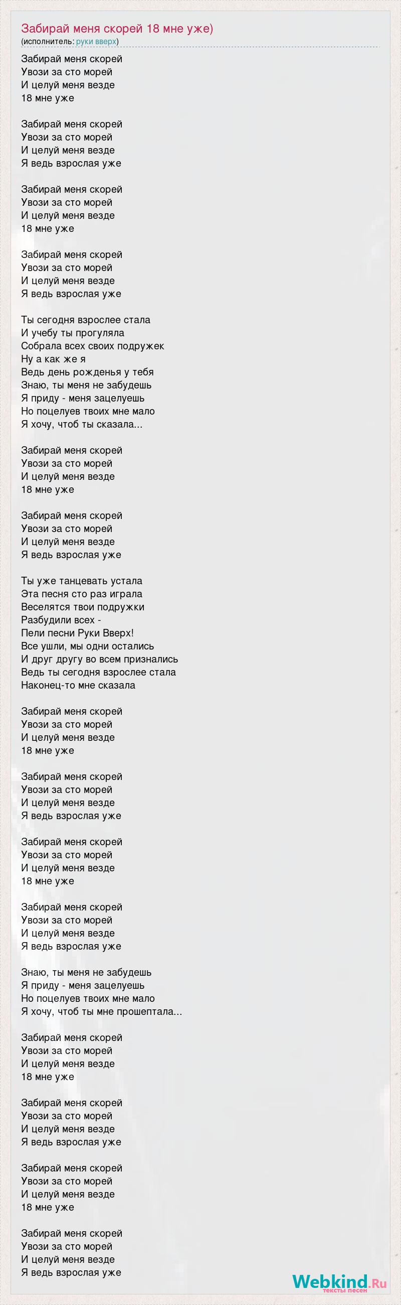 Забирай меня скорей Увози за сто морей И целуй меня везде 18 мне уже Забирай меня скорей Увози за сто морей И целуй меня везде Я ведь взрослая уже Забирай меня скорей Увози за сто морей И целуй меня везде 18 мне уже Забирай меня скорей Увози за сто морей И целуй меня везде Я ведь взрослая уже Ты сегодня взрослее стала И учебу ты прогуляла Собрала всех своих подружек Ну а как же я Ведь день рожденья у тебя Знаю, ты меня не забудешь Я приду - меня зацелуешь Но поцелуев твоих мне мало Я хочу, чтоб ты сказала... Забирай меня скорей Увози за сто морей И целуй меня везде 18 мне уже Забирай меня скорей Увози за сто морей И целуй меня везде Я ведь взрослая уже Ты уже танцевать устала Эта песня сто раз играла Веселятся твои подружки Разбудили всех - Пели песни Руки Вверх! Все ушли, мы одни остались И друг другу во всем признались Ведь ты сегодня взрослее стала Наконец-то мне сказала Забирай меня скорей Увози за сто морей И целуй меня везде 18 мне уже Забирай меня скорей Увози за сто морей И целуй меня везде Я ведь взрослая уже Забирай меня скорей Увози за сто морей И целуй меня везде 18 мне уже Забирай меня скорей Увози за сто морей И целуй меня везде Я ведь взрослая уже Знаю, ты меня не забудешь Я приду - меня зацелуешь Но поцелуев твоих мне мало Я хочу, чтоб ты мне прошептала... Забирай меня скорей Увози за сто морей И целуй меня везде 18 мне уже Забирай меня скорей Увози за сто морей И целуй меня везде Я ведь взрослая уже Забирай меня скорей Увози за сто морей И целуй меня везде 18 мне уже Забирай меня скорей Увози за сто морей И целуй меня везде Я ведь взрослая уже