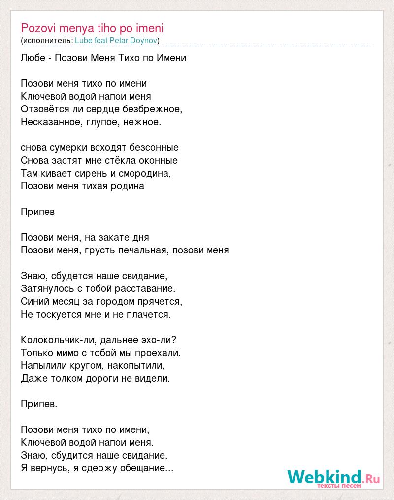 Любе - Позови Меня Тихо по Имени Позови меня тихо по имени Ключевой водой напои меня Отзовётся ли сердце безбрежное, Несказанное, глупое, нежное. снова сумерки всходят безсонные Снова застят мне стёкла оконные Там кивает сирень и смородина, Позови меня тихая родина Припев Позови меня, на закате дня Позови меня, грусть печальная, позови меня Знаю, сбудется наше свидание, Затянулось с тобой расставание. Синий месяц за городом прячется, Не тоскуется мне и не плачется. Колокольчик-ли, дальнее эхо-ли? Только мимо с тобой мы проехали. Напылили кругом, накопытили, Даже толком дороги не видели. Припев. Позови меня тихо по имени, Ключевой водой напои меня. Знаю, сбудится наше свидание. Я вернусь, я сдержу обещание...