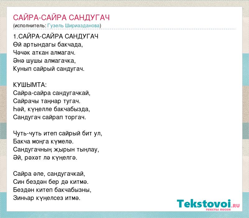 1.САЙРА-САЙРА САНДУГАЧ Өй артындагы бакчада, Чәчәк аткан алмагач. Әнә шушы алмагачка, Кунып сайрый сандугач. КУШЫМТА: Сайра-сайра сандугачкай, Сайрачы таңнар тугач. Һәй, күңелле бакчабызда, Сандугач сайрап торгач. Чуть-чуть итеп сайрый бит ул, Бакча моңга күмелә. Сандугачның җырын тыңлау, Әй, рәхәт лә күңелгә. Сайра әле, сандугачкай, Син бездән бер дә китмә. Бездән китеп бакчабызны, Зинһар күңелсез итмә.