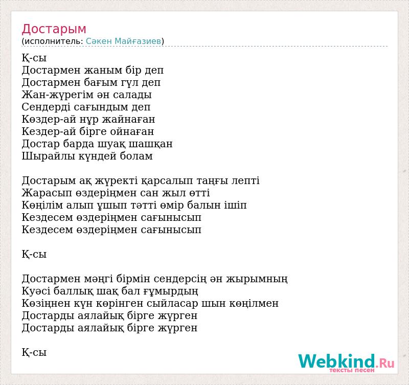 Қ-сы Достармен жаным бір деп Достармен бағым гүл деп Жан-жүрегім ән салады Сендерді сағындым деп Көздер-ай нұр жайнаған Кездер-ай бірге ойнаған Достар барда шуақ шашқан Шырайлы күндей болам Достарым ақ жүректі қарсалып таңғы лепті Жарасып өздеріңмен сан жыл өтті Көңілім алып ұшып тәтті өмір балын ішіп Кездесем өздеріңмен сағынысып Кездесем өздеріңмен сағынысып Қ-сы Достармен мәңгі бірмін сендерсің ән жырымның Куәсі баллық шақ бал ғұмырдың Көзіңнен күн көрінген сыйласар шын көңілмен Достарды аялайық бірге жүрген Достарды аялайық бірге жүрген Қ-сы
